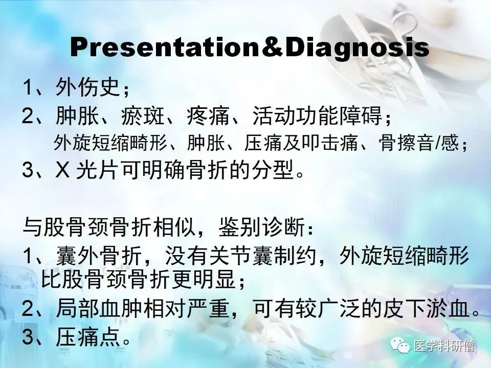股骨转子间骨折的患者通常有明确的外伤史,如跌倒时臀部着地等。临床症状主要包括疼痛、肿胀、活动受限等,严重时还可出现肢体短缩、外旋畸形等体征。X光片是诊断股骨转子间骨折的首选检查方法,能够清晰地显示骨折线的位置、形态及移位情况,为分型和治疗提供重要依据。