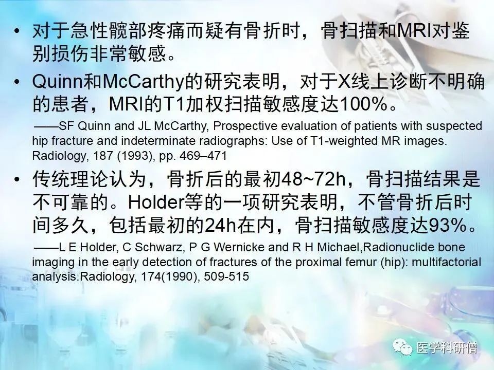 在某些特殊情况下,如骨折线不明显或疑似隐匿性骨折时,骨扫描和MRI等影像学检查可发挥重要作用。骨扫描能够显示骨骼的代谢活动情况,对于发现早期骨折或骨折愈合过程中的异常变化具有较高敏感性。而MRI则能够更清晰地显示软组织损伤情况,如肌肉、韧带等结构的损伤,对于全面评估伤情、制定治疗方案具有重要价值。