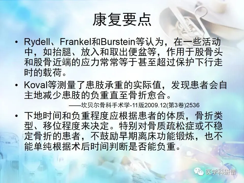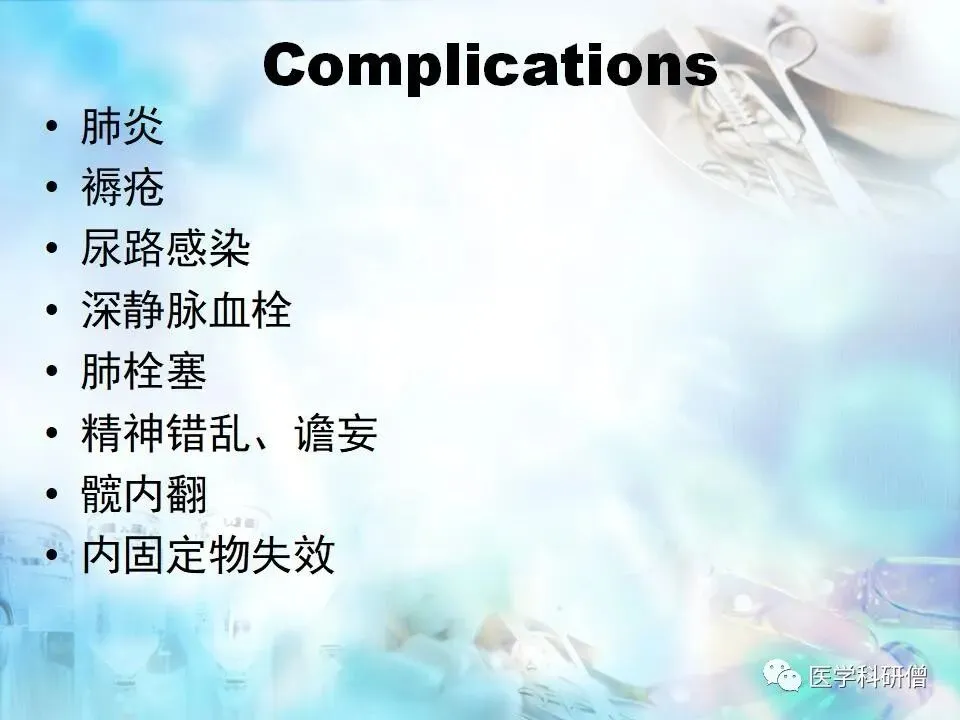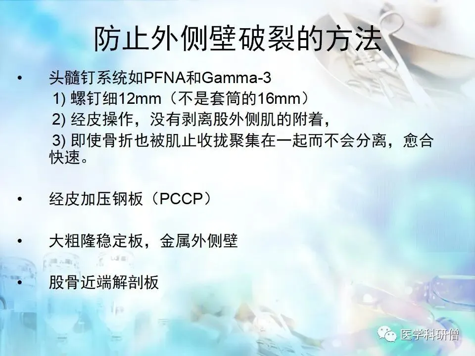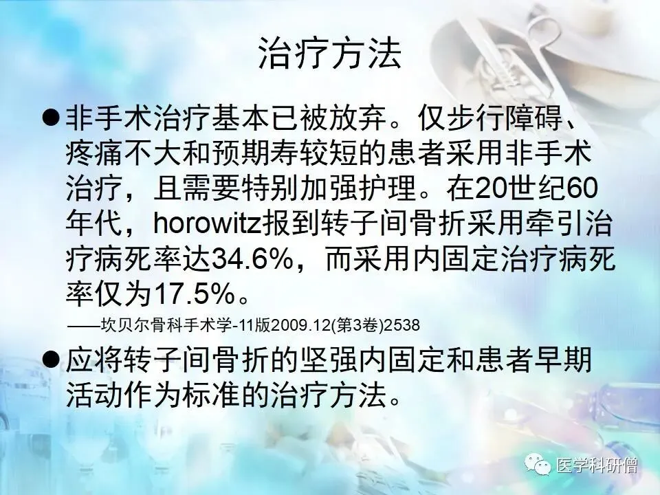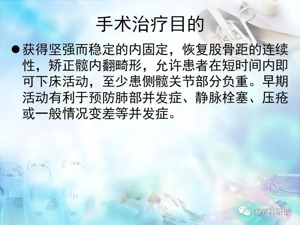 手术治疗股骨转子间骨折的主要目的是恢复骨折端的解剖关系,促进骨折愈合,同时尽可能减少并发症的发生。手术原则包括彻底清创、准确复位、牢固固定及早期功能锻炼等。彻底清创是预防感染的关键;准确复位是确保骨折愈合的基础;牢固固定则是维持复位位置、促进骨折愈合的重要保障;而早期功能锻炼则有助于恢复关节功能,减少并发症的发生。
