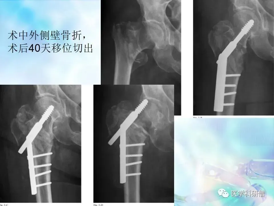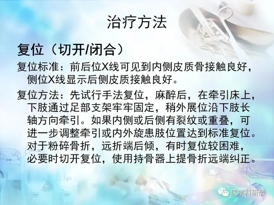 复位是股骨转子间骨折手术治疗的关键步骤之一。复位标准主要包括恢复骨折端的解剖关系、恢复肢体的长度和力线以及消除旋转畸形等。复位方法主要包括手法复位和手术复位两种。手法复位适用于稳定性好、移位不明显的骨折;而手术复位则适用于稳定性差、移位明显的骨折,通过手术切开暴露骨折端,进行准确复位。