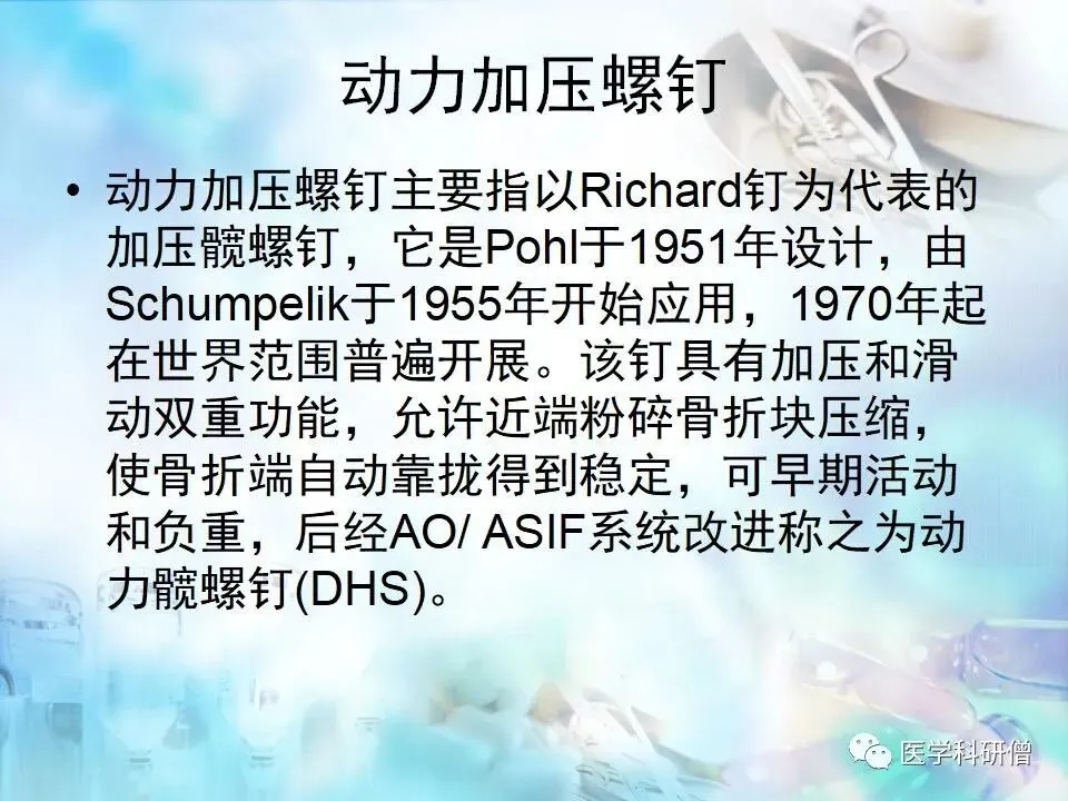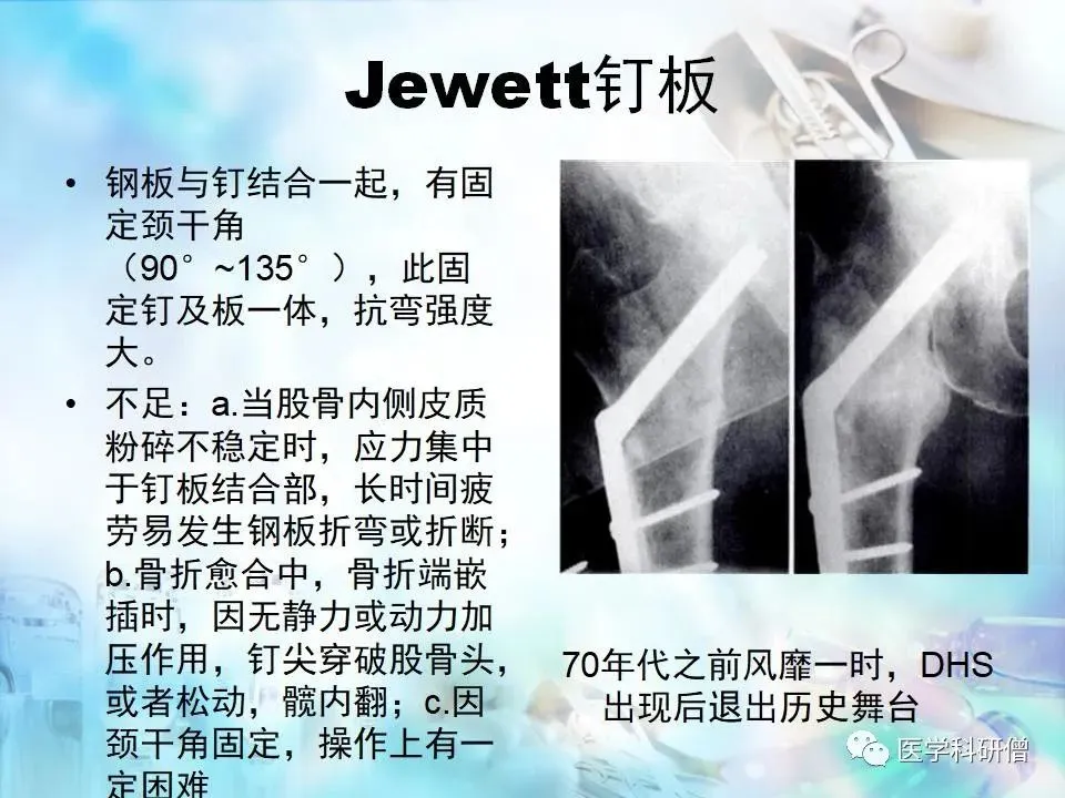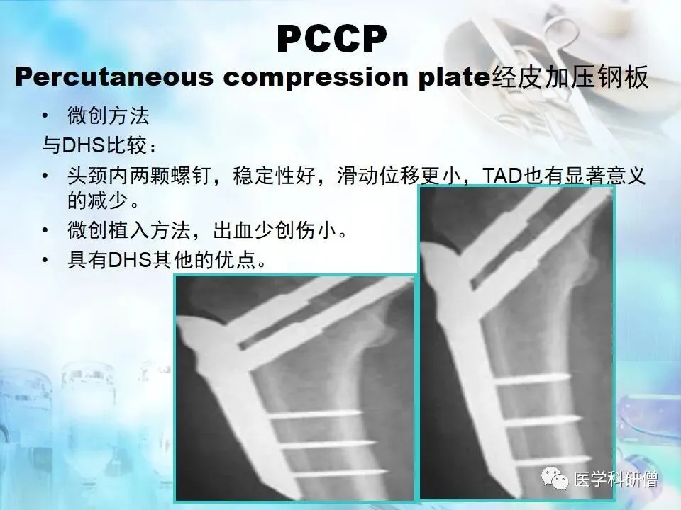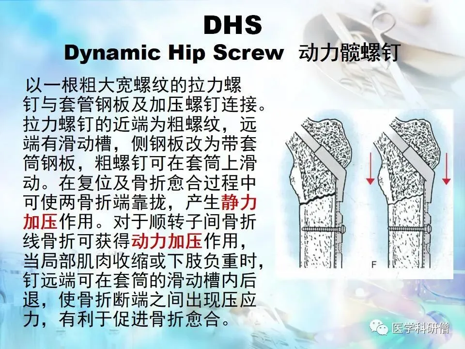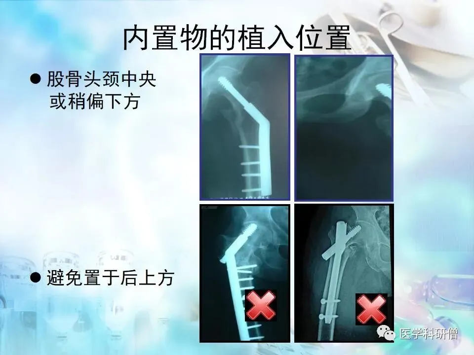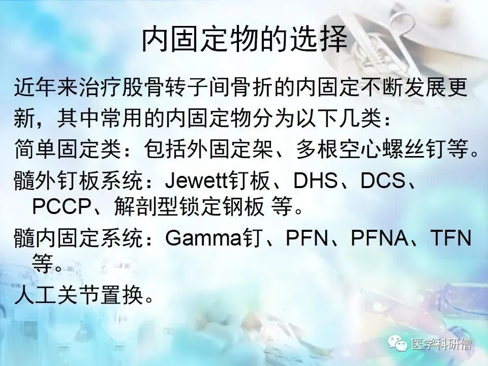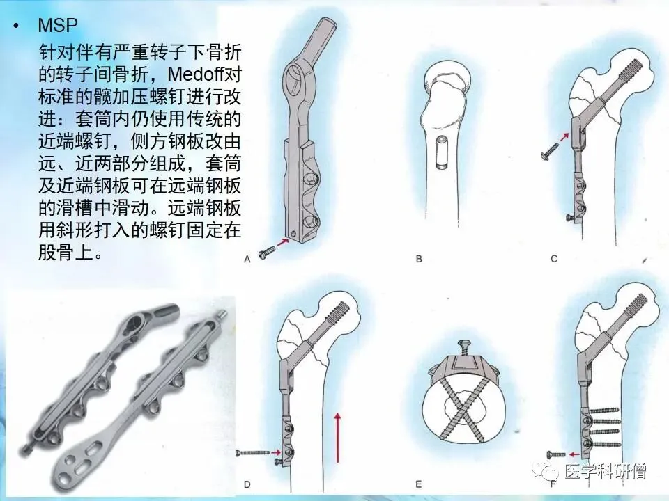 内固定物的种类繁多,根据材料、形状、功能等不同可分为多种类型。在股骨转子间骨折的治疗中,常用的内固定物包括拉力螺钉、钢板、髓内钉等。拉力螺钉主要用于固定骨折端,促进骨折愈合;钢板则能够提供更为稳定的支撑和固定作用;而髓内钉则适用于股骨转子间骨折的髓内固定治疗,具有手术创伤小、固定效果可靠等优点。