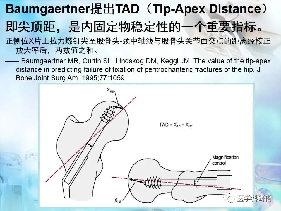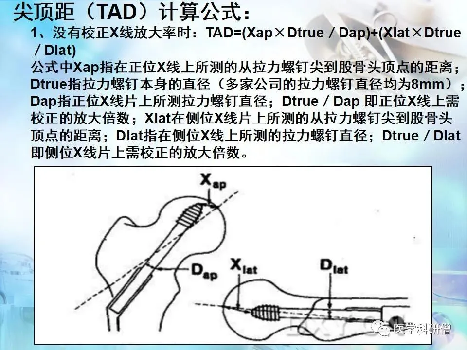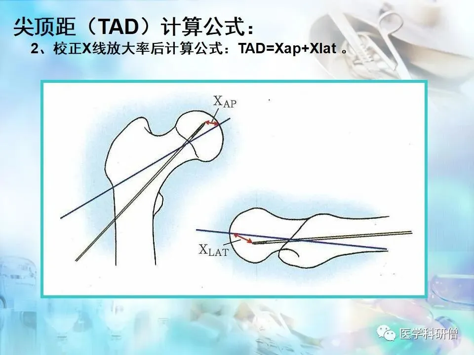 尖顶距(Tip-Apex Distance,TAD)是评估股骨转子间骨折内固定效果的重要指标之一。它是指内固定物(如拉力螺钉)的尖端与股骨头顶点之间的垂直距离。TAD的计算公式通常根据具体的内固定物和骨折类型而有所不同,但一般通过测量X光片上相关结构的尺寸和角度来计算得出。