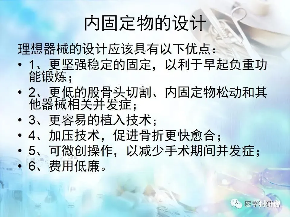 理想的内固定物设计应满足以下要求:首先,应具有良好的生物相容性和耐腐蚀性,以确保长期植入体内不会引发不良反应;其次,应具有足够的强度和刚度,能够承受骨折端的应力和变形;同时,还应具有合理的形状和尺寸,以适应骨折端的形态变化;最后,内固定物的设计还应考虑便于手术操作和植入,以及术后易于取出等因素。
