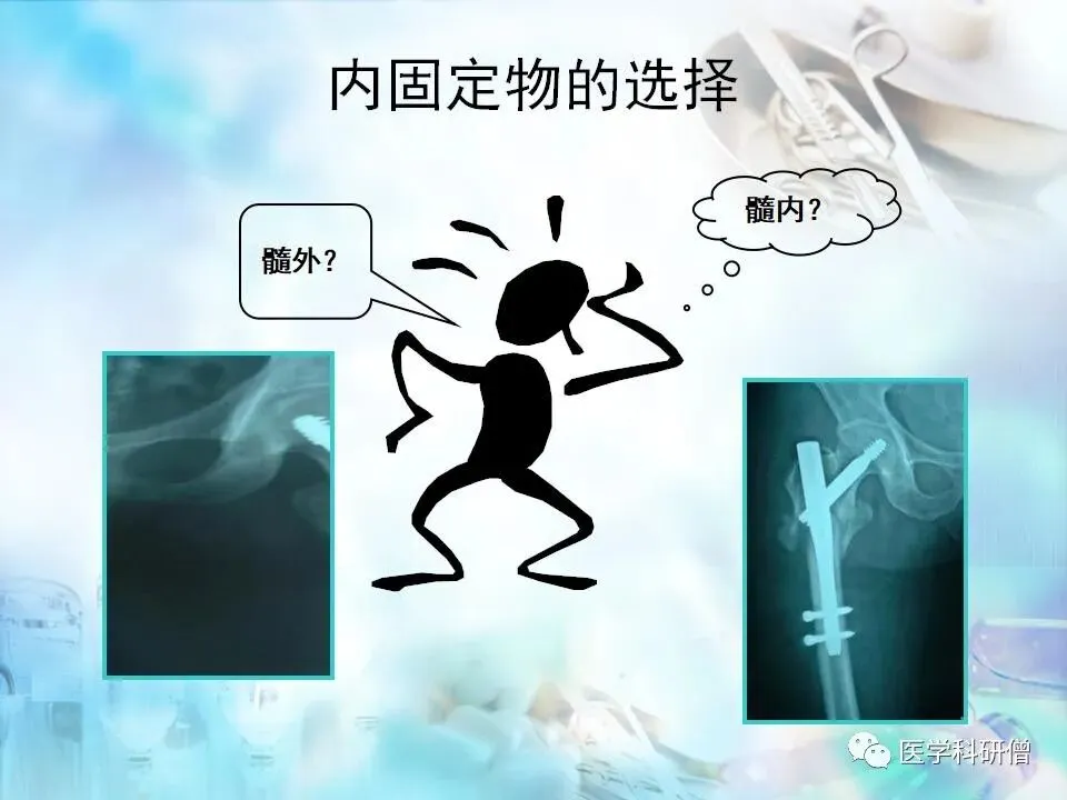 髓内固定和髓外固定是股骨转子间骨折治疗的两种主要固定方式。髓内固定主要通过将内固定物(如髓内钉)插入股骨髓腔内进行固定,具有手术创伤小、固定效果可靠、术后恢复快等优点;而髓外固定则主要通过在骨折端外侧放置内固定物(如钢板、拉力螺钉等)进行固定,适用于骨折端移位明显或髓内固定难以实施的情况。在临床实践中,医生需要根据患者的具体情况和骨折类型选择合适的固定方式,以确保治疗效果。