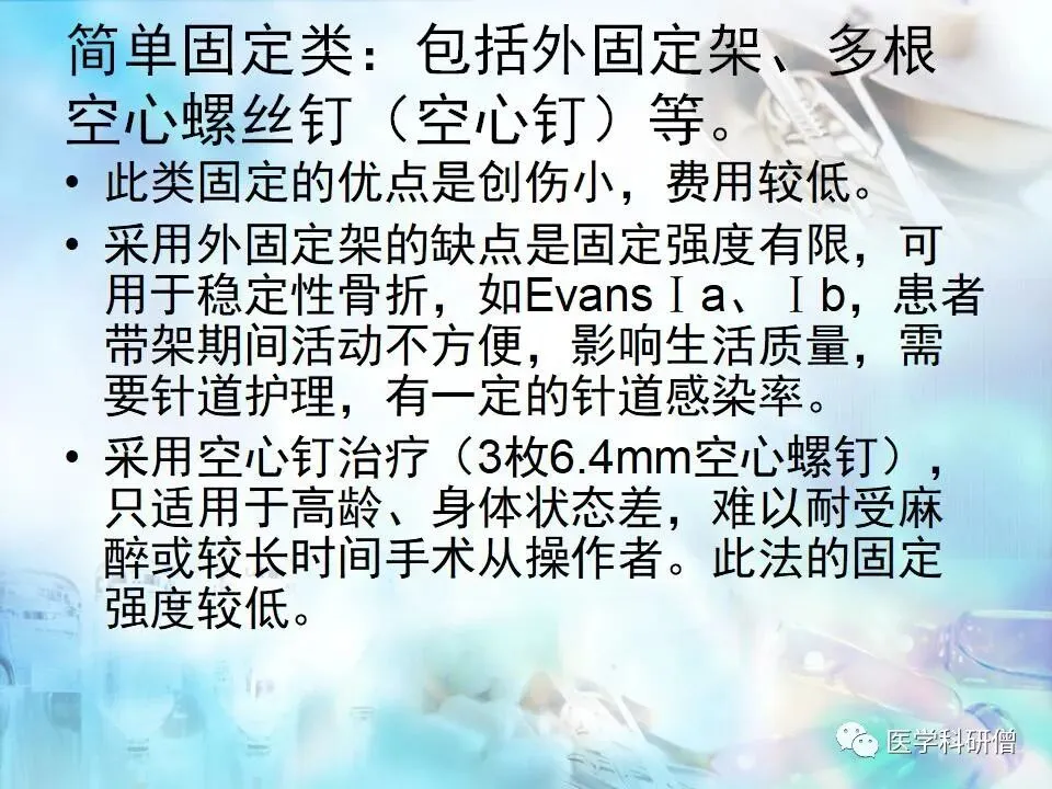 Evans分型不仅有助于描述骨折的形态学特征,还能对骨折的稳定性进行初步评估。一般来说,I型和部分II型骨折因骨折端移位较小,相对稳定,可采取保守治疗或较为简单的手术治疗。而III型、IV型及部分移位严重的II型骨折,由于稳定性差,常需采用更为复杂的手术方法进行固定和治疗。