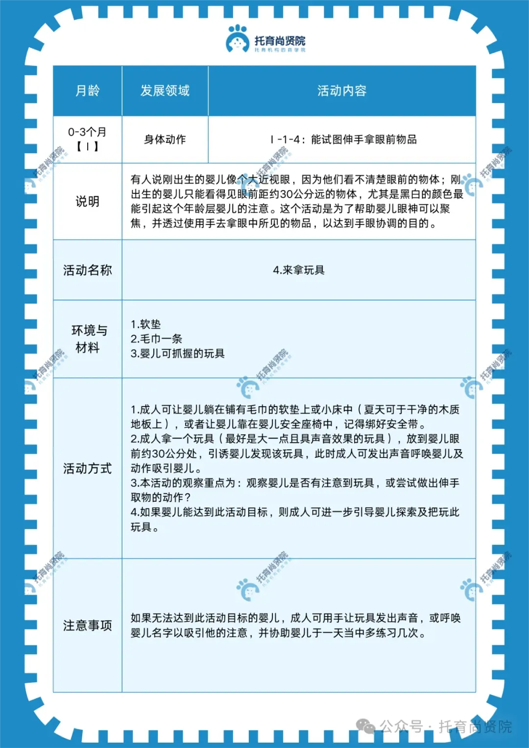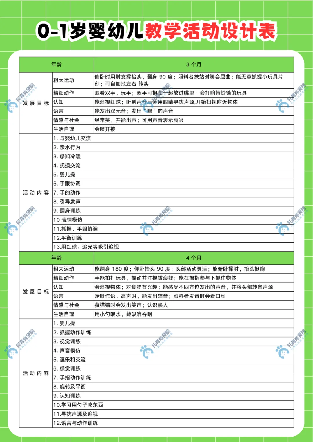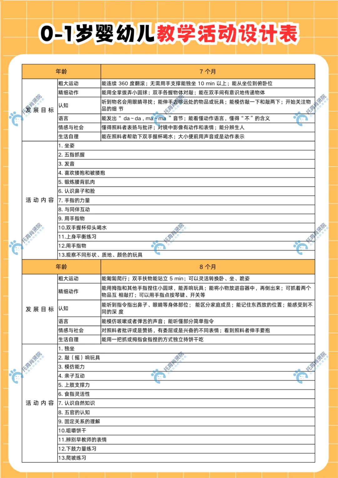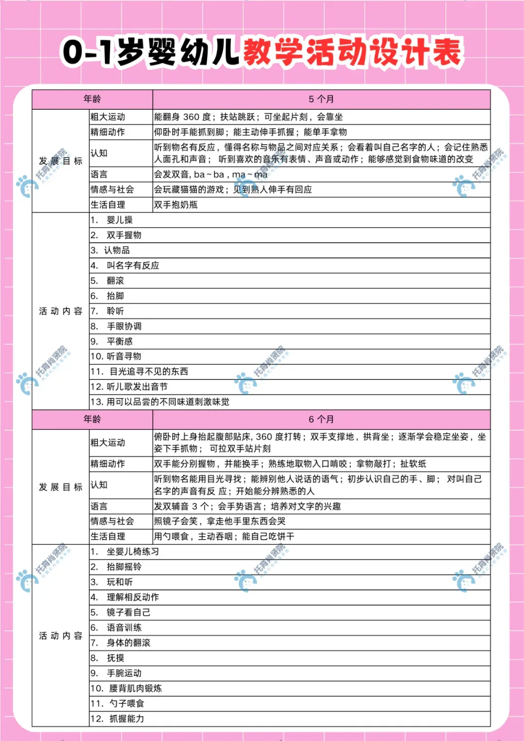 含0-1岁宝宝每个月龄的发展目标(粗大运动、精细动作、认知、语言、情感社会)以及活动设计主要方向和内容。供大家参考。乳儿班宝宝的活动设计应该遵循宝宝个体的发展特点和需求,活动时间和安排要有一定的弹性和适宜性,活动内容可以根据具体情况有所调整。