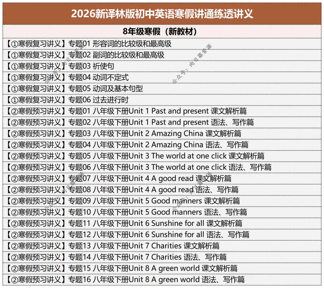 【2】2026八年级寒假复习6专题+预习16专题,预习八下整本。新教材配套,每个单元预习讲义包含课文精析和语法讲解,课文精析包括原文,译文,要点讲解,单词。语法讲解包括详细的语法精讲和写作讲解。