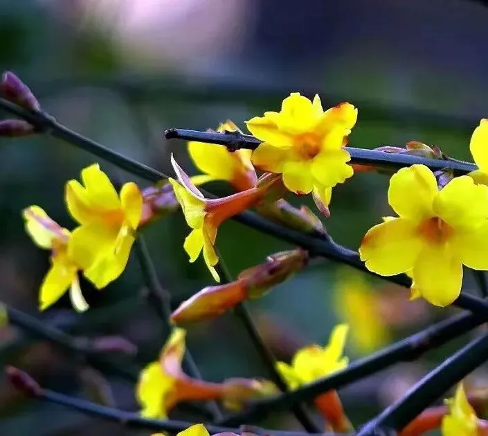 出示迎春花实物或高清图片,通过提问引导幼儿仔细观察:“迎春花是什么颜色的?它的花瓣像什么?(小喇叭)枝条是直直的还是弯弯的?叶子多吗?” 教师总结:迎春花是黄色的,先开花后长叶,枝条细长,常常向下垂。