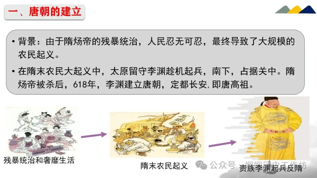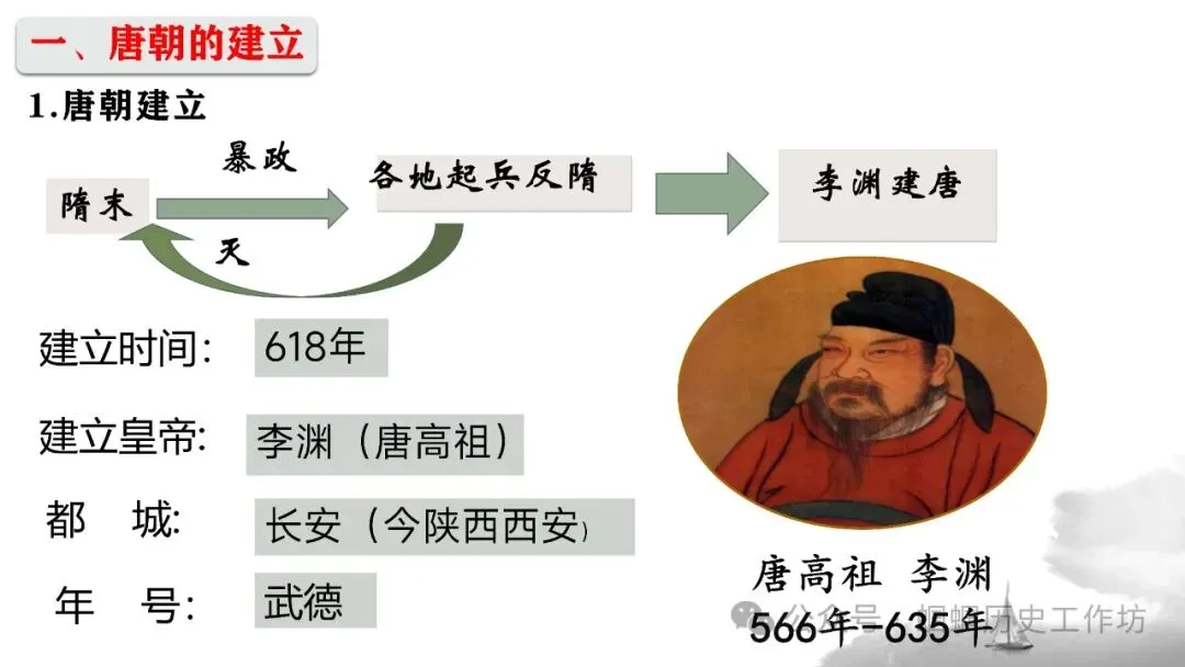 1.唐朝的建立:时间:618年,建立者:李渊,都城:长安