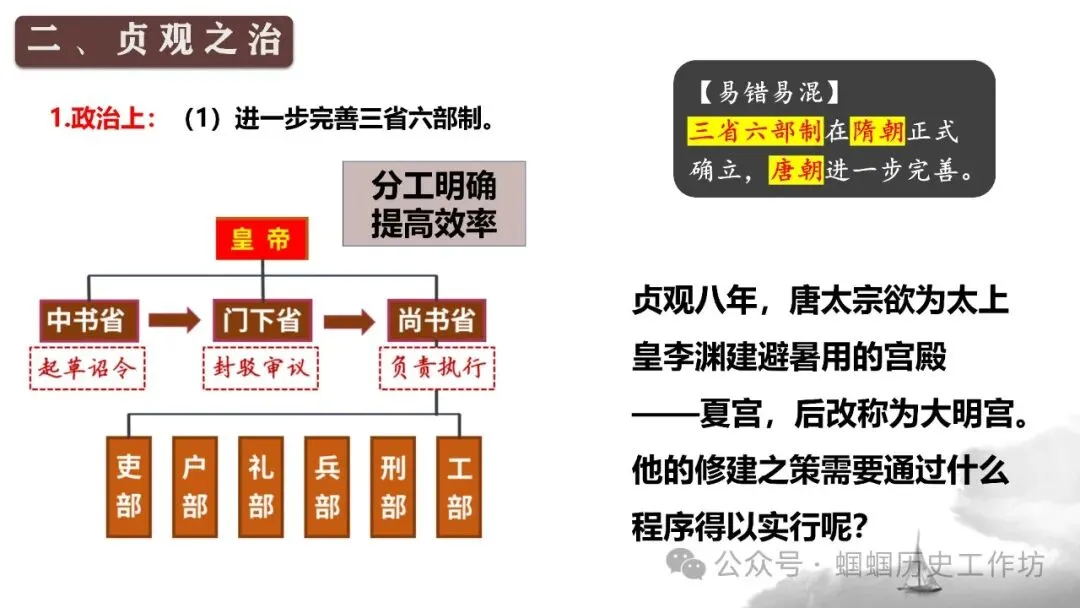 【详解】根据材料中的“贞观”“中书”“门下”可知,这是唐朝的三省六部制。结合所学可知,贞观时期推行了一系列革新的措施。在政治上,进 一步完善三省六部制,唐朝的三省包括中书省、门下省和尚书省;六部包括吏部、户部、礼部、 兵部、刑部和工部,三省六部制分工明确,提高了政府的行政效率,B项正确;材料涉及的是三省六部制,没有提及科举制,排除A项;藩镇割据现象出现在唐末五代时期,与“贞观年间”不符,排除C项;北宋实行重文轻武政策,排除D项。故选B项。