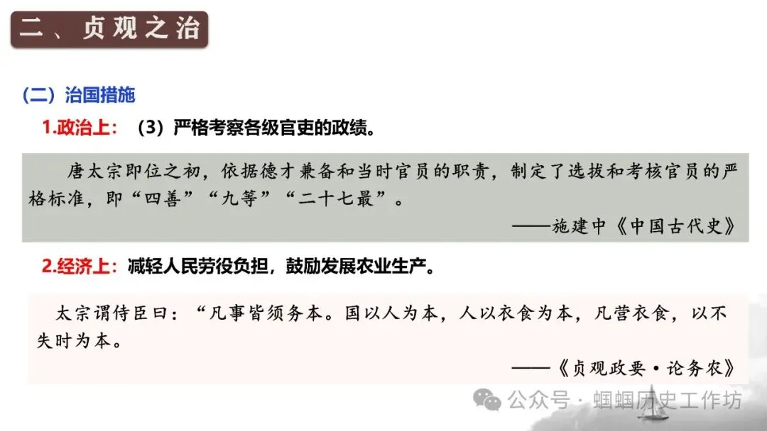 2、治国思想:吸取隋朝速亡的历史教训,励精图治、勤于政事,澄清吏治、虚心纳谏,从善如流,戒奢从简,施行与民休息的政策,广纳贤才,知人善任。当时人才有魏征、房玄龄、杜如晦等。
