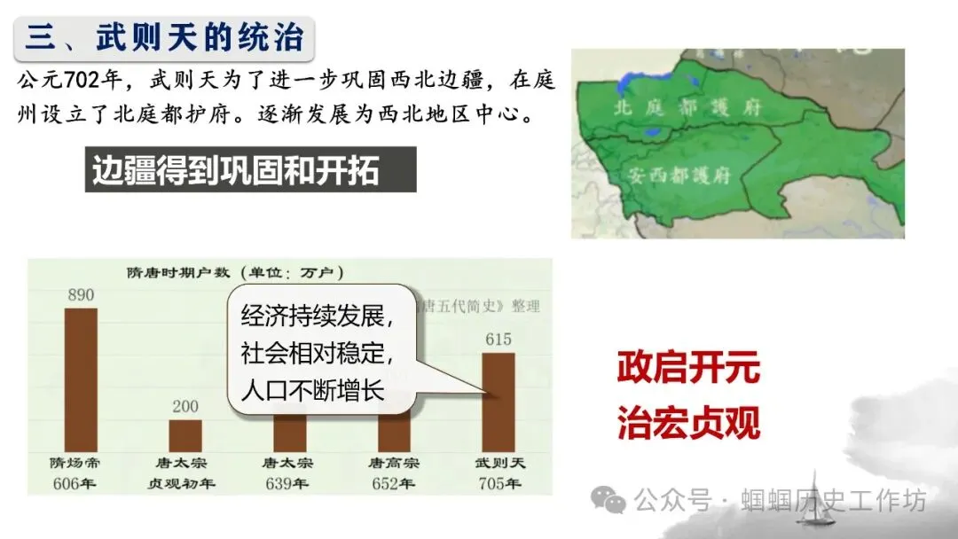 3、治国效果:经济得以持续发展,社会相对安定,人口不断增长,为后来“开元盛世”局面的出现奠定了基础。
