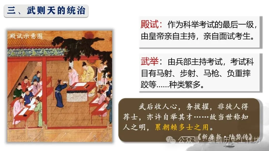 2、统治措施:大力发展科举制,创立殿试;不拘一格选拔人才,不仅扩大了统治基础,也使贤能之士脱颖而出;继续推行减轻百姓负担的政策和措施,重视发展生产。
