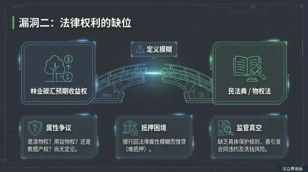 想要打破“叫好不叫座”的僵局,必须看清报告揭示的深层逻辑。目前市场最大的风险在于农户与企业的博弈失衡。报告警告,在缺乏完善实体规则的情况下,作为弱势方的农户极易面临“失林又失汇”的风险;而金融机构因无法确认“未来收益权”的可质押性及价值波动,往往采取回避态度。报告通过调研10家商业银行与多家林业公司,揭示了当前碳汇质押中“确权难、评估难、监管难”的真实困境,并强调只有解决这些制度性难题,才能防止碳汇交易沦为部分企业的洗钱工具或单纯的数字游戏。