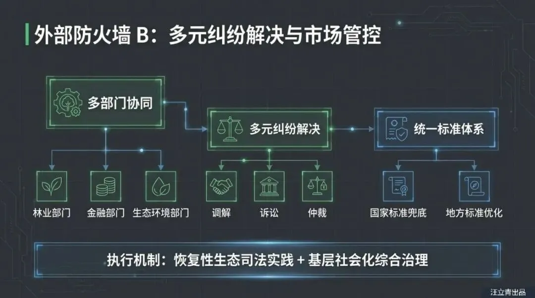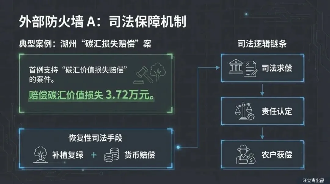 破局之道何在?报告给出了一套严密的“二元治理”路线图。对内规制,必须建立动态的价值评估机制与明确的质押登记系统(如央行动产融资系统),让“未来的空气”变成银行认可的“现在的资产”,并制定保护农户行权的实体规则;对外治理,则需构建强有力的司法保障,通过“恢复性司法+赔偿碳汇损失”的公益诉讼模式,为碳汇价值保驾护航。读透这份报告,助您掌握从“固碳增汇”到“生态富农”的法治化密码,抢占碳汇金融化的未来先机!