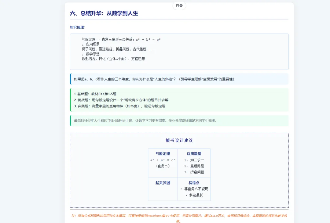格式转换:系统一键将Markdown转换为精美的HTML格式课件,自动排版、优化视觉呈现,适配多种设备与演示场景。