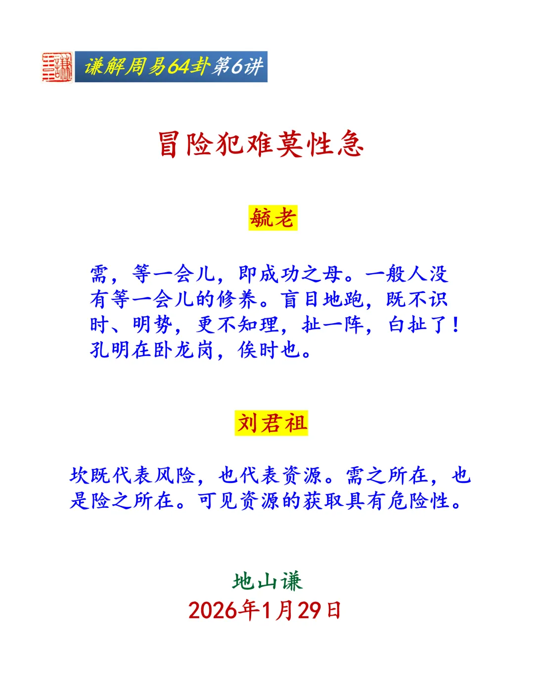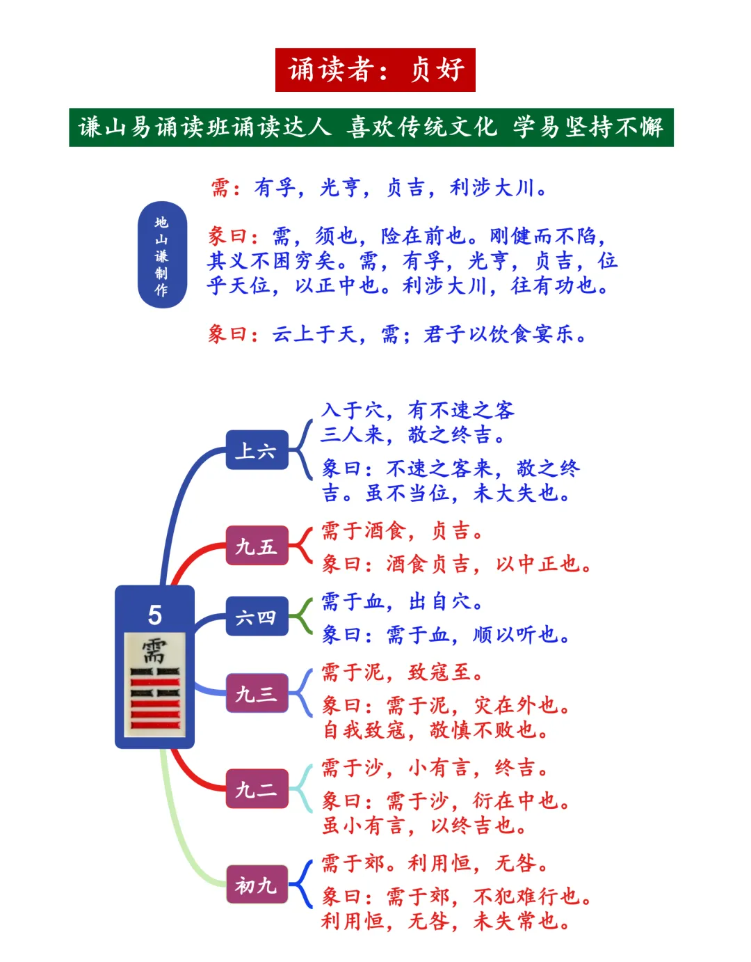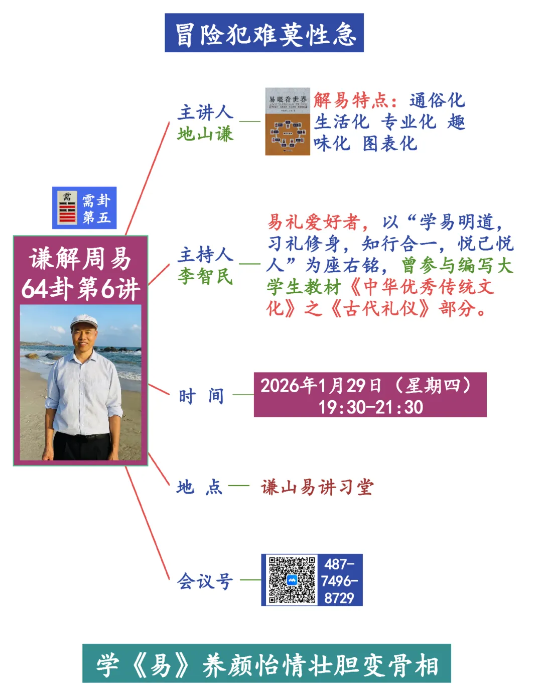 【按】2026年1月29日,地山谦以“冒险犯难莫性急”为题,开启了需卦的讲授,谦山易诵读班副班长、开“颠背”周易之先河的李晓婷老师以一首《满庭芳·需》将气氛带入高潮。讲座由易礼爱好者、大学生教材《中华优秀传统文化》之《古代礼仪》编写老师、谦山易诵读班诵读达人李智民老师主持,谦山易研习班68人参与互动。应广大易友的要求,特将内容整理如下,以飨众易友。