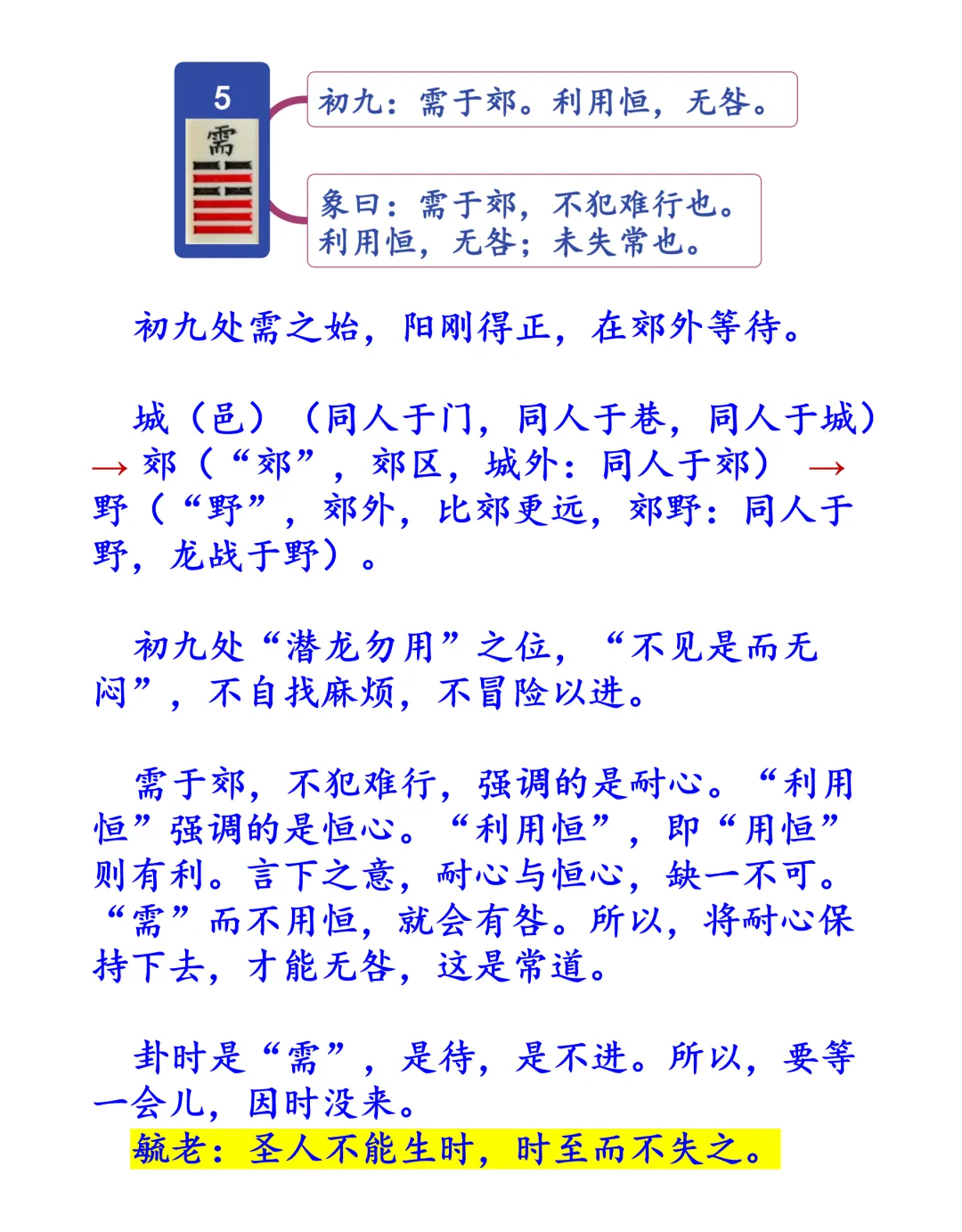 需,等一会儿,即成功之母。一般人没有等一会儿的修养。盲目地跑,既不识时,明势,更不知理,扯一阵,白扯了!孔明在卧龙岗,俟时也。