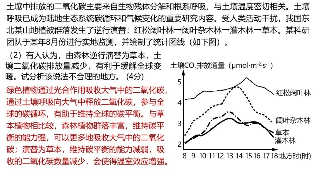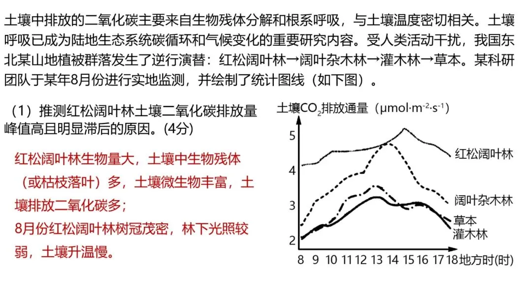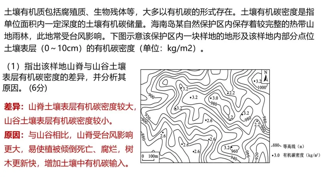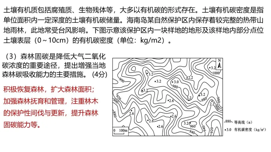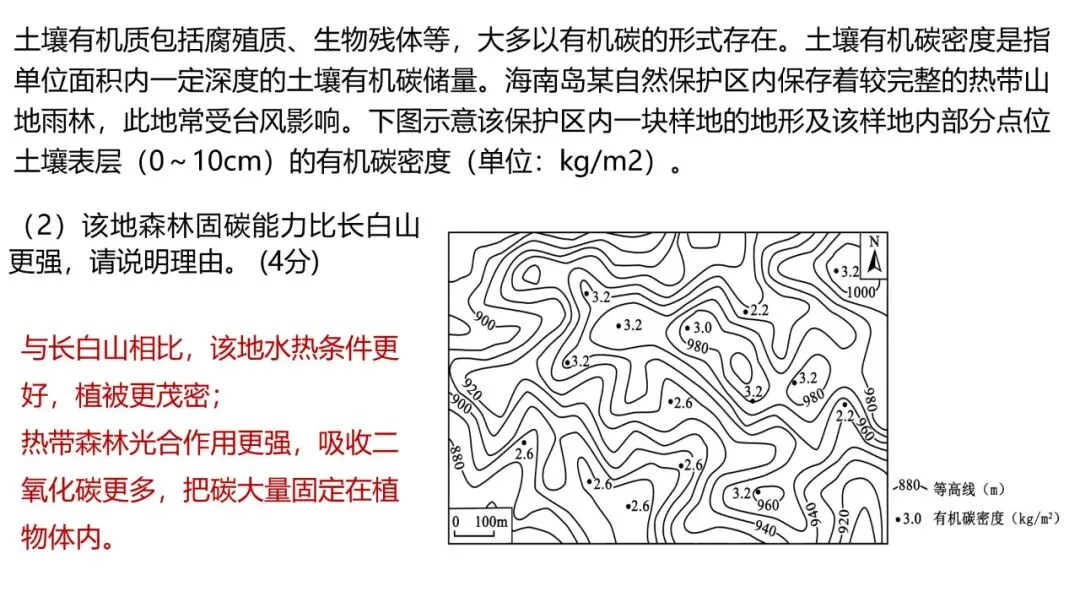 (3)植物冠内郁闭度高,对降水、地表径流等具有截留作用,增加土壤水分;植物冠内郁闭度高,可以降风滞尘,增加土壤养分;植物冠层可以遮蔽光照,减少土壤水分蒸发,减轻外力对土壤的侵蚀,加快养分循环;冠下动植物遗留物丰富,土壤表层养分积累多。