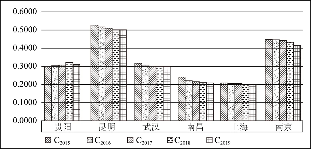 人口集中度指数(C表示)通常用来描述区域内人口分布的集中程度。C值越大,说明区域的人口分布越集中,表示人口分布越不均匀;C值越小,越接近于零,表示人口呈现均匀分布。图示意长江经济带6市2015~2019年人口集中度指数变化情况。据此完成下面小题。