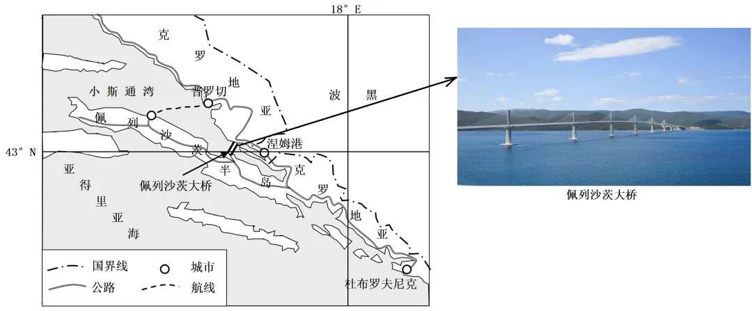 杜布罗夫尼克被称为“亚得里亚海滨明珠”,是欧洲重要旅游城市。由于历史和地理原因,与克罗地亚本土被波黑隔开,当地居民往返两地要穿越其他国家。2022年8月5日,由中企承建的佩列沙茨大桥正式通车,结束了该国领土长期隔离状态。大桥跨越亚得里亚小斯通湾,总长2440m,桥面两侧设有C字形挡风板,桥体共14个墩台,其中10个墩台布置在平均深度为27m的海中,7~8号桥墩主跨设置尺寸为200m×55m。图示意佩列沙茨大桥位置。据此完成下面小题。