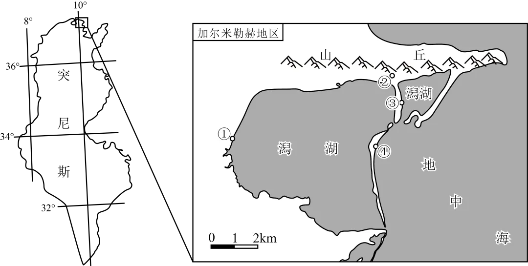 加尔米勒赫地区(下图)的居民利用潟湖沙坝种植作物。当山丘上的雨水到达高潮时,雨水并未立即与下层咸水混合,而是在表面形成薄层淡水,并随潮汐被输送至耕作区的作物根部,在无人工供水的情况下实现全年种植。此外,当地居民还根据潟湖的水位变化,采用增减少土的方式调整作物种植高度,避免作物根系受下层咸水影响。据此完成下面小题。