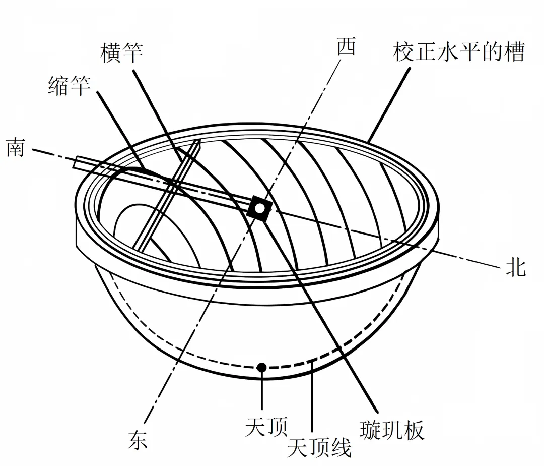小明于夏至日时到某地(113°E,34.5°N)参观了天文观测仪器—仰仪。仰仪形似一口大锅仰面朝天,在其南部放置横杆和缩杆,缩杆末端延伸到半球中心,装有一块中央有小孔、可以上下和左右旋转的小方板(璇玑板)。观测时,让璇玑板正对太阳,据小孔成像原理,使太阳光通过小孔在球面上形成太阳影像。图示意小明绘制的仰仪。据此完成下面小题。