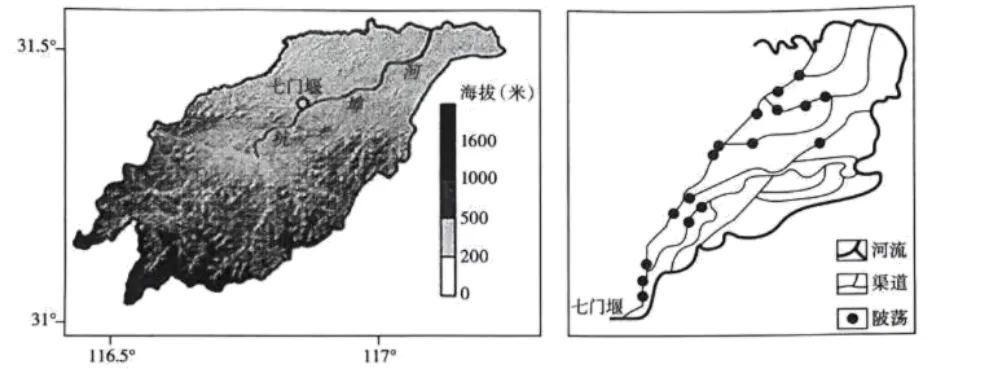 安徽省舒城县位于大别山东麓,地处江淮分水过渡带,岗丘地区(山岗和丘陵地区)易旱,平原地区易涝。2023年舒城县七门堰调蓄灌溉系统入选世界灌溉工程遗产名录。七门堰选址在河流由山区进入平原的“谷口”地段,取水口设置在河流凹岸,灌溉渠充分利用地形条件,由高到低设计,连接着1万7千多个塘、荡,两千多年来持续发挥着灌溉、防旱涝作用。下左图示意舒城县地形,右图示意七门堰调蓄灌溉系统。