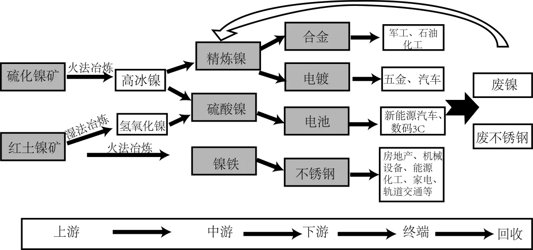 “碳中和”背景下,战略性新兴产业和低碳能源技术的发展高度依赖镍等关键金属。印度尼西亚是红土镍矿资源王国,储量居全球第一。近年来,当地政府重视国家镍产业的发展,限制红土镍矿出口并支持其深加工,印尼政府以“镍矿加工—电池—电动汽车制造”为主要环节建设镍全产业链。2014年起,我国多家企业依托“红土镍矿—镍铁—不锈钢”生产工艺上具有的独特技术优势,对印尼镍产业进行全产业链投资,促进了镍产业升级与环境保护的同步发展。图示意镍资源产业链。