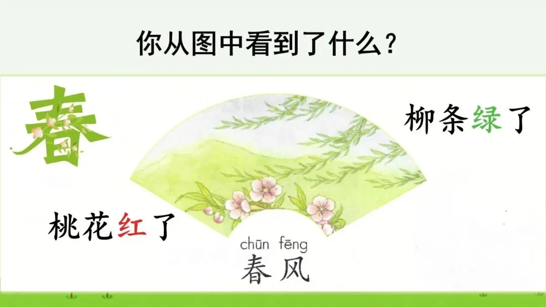(1)出示扇面画“春”。认读词语“春风”。