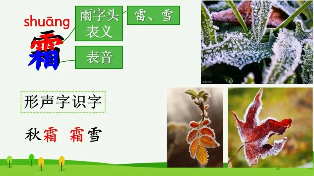 ②学习“霜”字。“霜”是一个形声字,上面的雨字头表义,下面的“相”表音,可以组词为“秋霜、霜雪”。有雨字头的字大多和天气有关,比如“雷”“雪”。