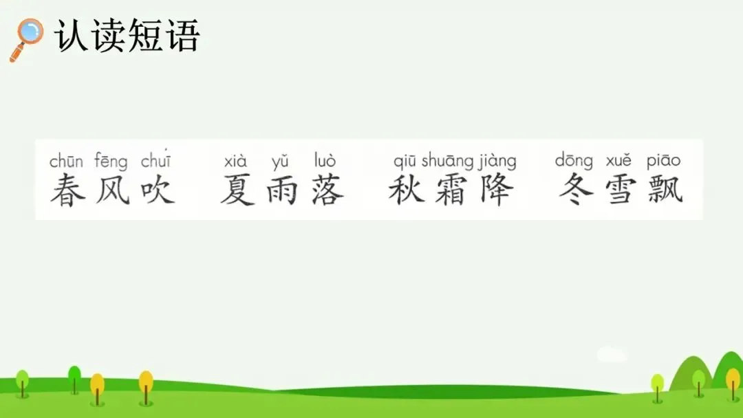 出示词语:春风吹、夏雨落、秋霜降、冬雪飘。(出示课件14)