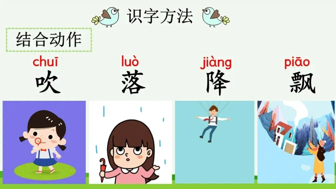 师生小结:“吹、落、降、飘”四个动词都是表示四季事物来到人间的方式。