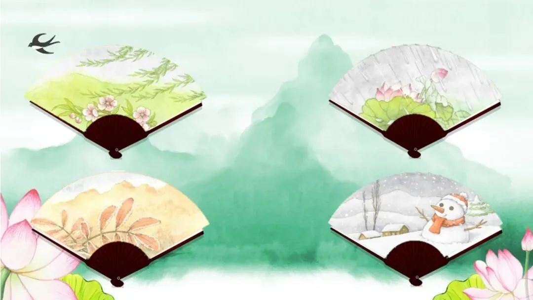 1.教师过渡:扇面画是中国宝贵的传统艺术品,看一看课本第一部分的插图,说一说它们分别代表哪个季节。