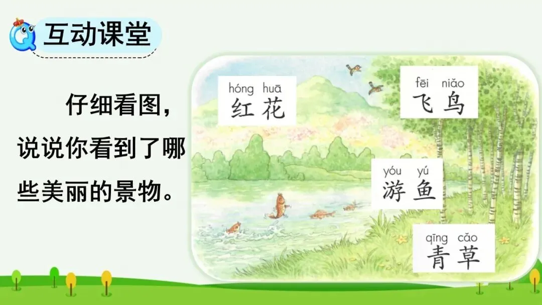 (板书:青草 红花 游鱼 飞鸟)