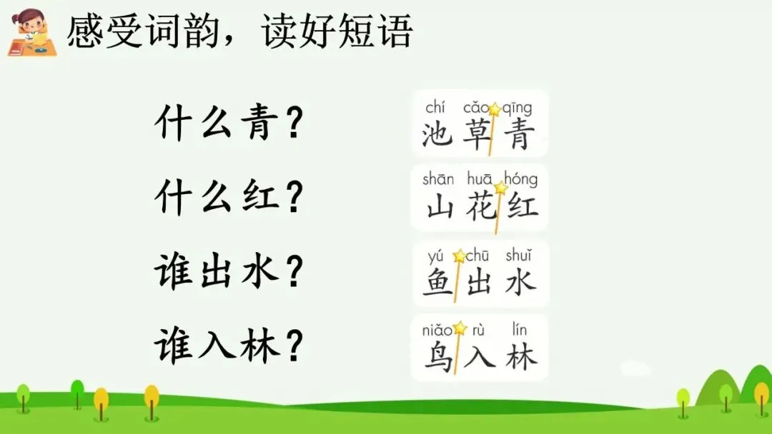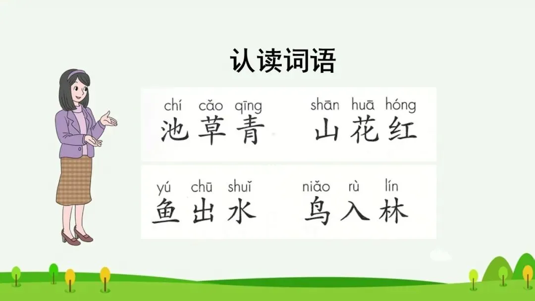 出示词语:池草青、山花红、鱼出水、鸟入林。(板书:池草青 山花红 鱼出水 鸟入林)