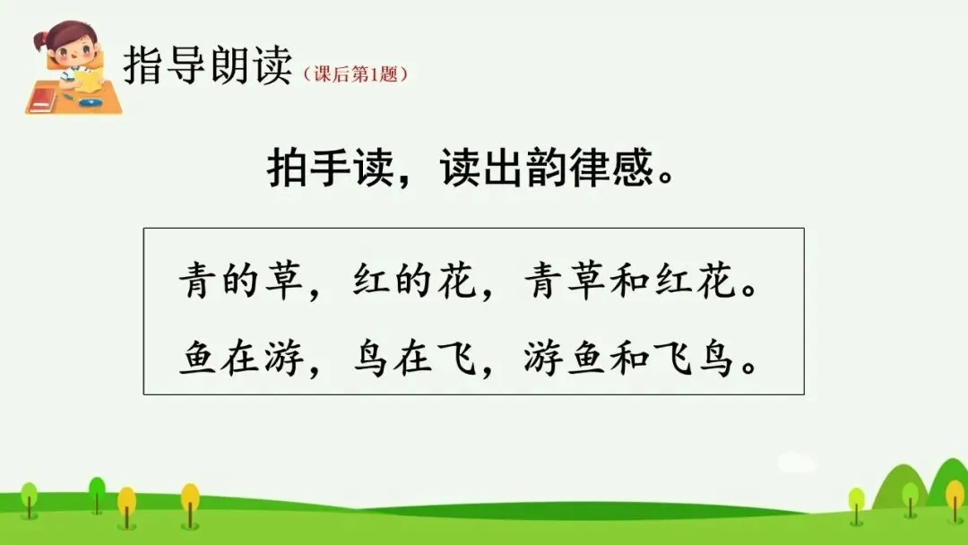 教师引导学生拍手读,读出韵律感。(出示课件29)