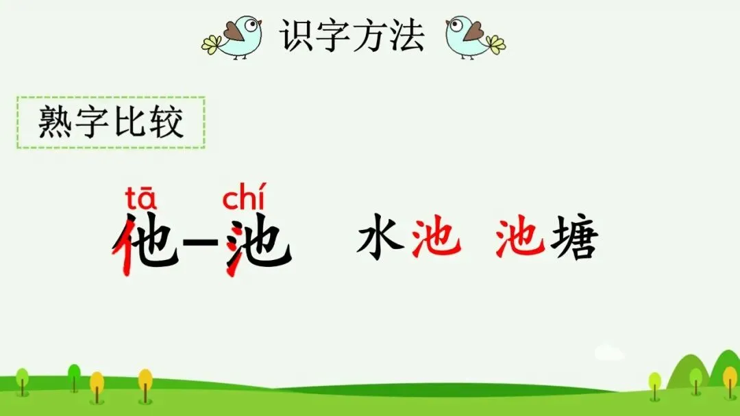 (1)对比生字“他”和“池”,引导学生用换偏旁的方法记住“池”字。