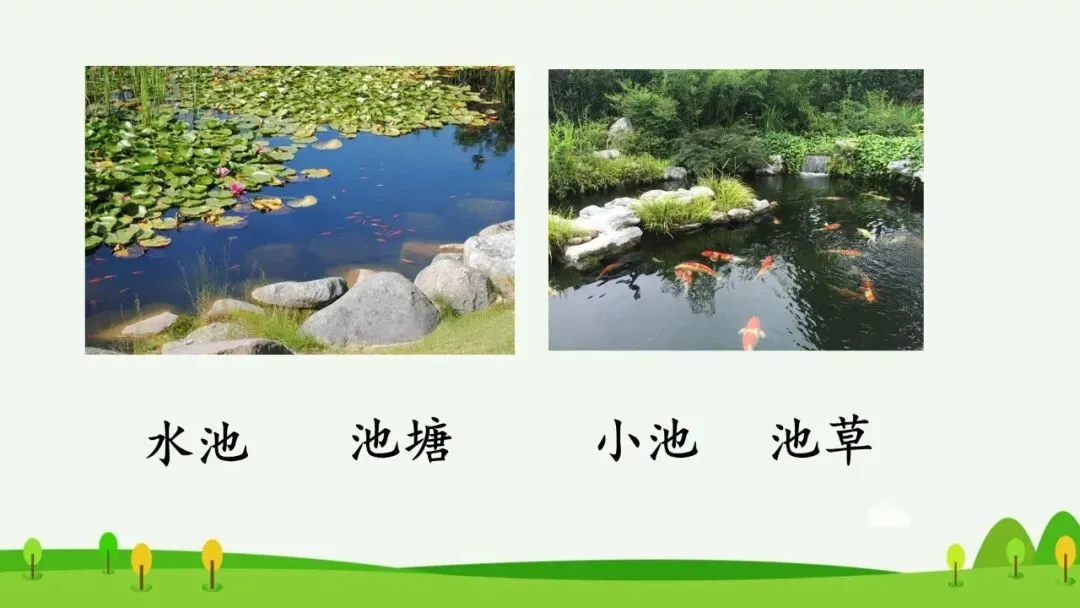 预设:水池、池塘、小池、池草。