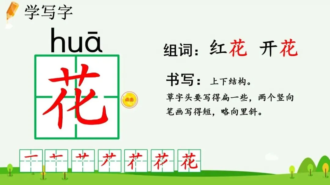 1.教师指导学生书写“花”。(出示课件36)