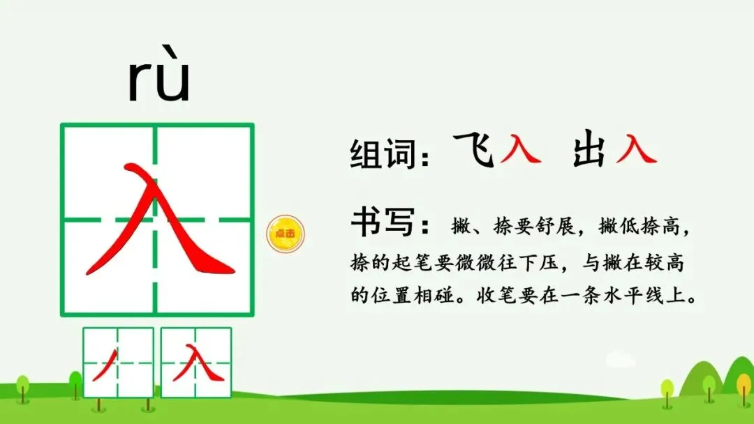 (3)对比生字“人”和“入”,引导学生观察两个字的区别,组词并认读:飞入、进入。
