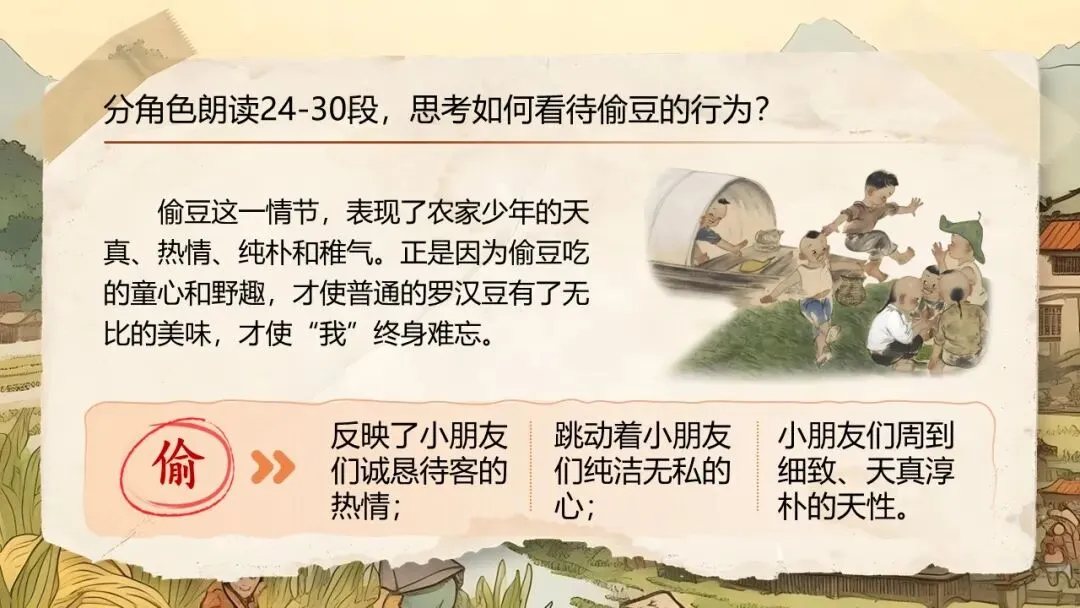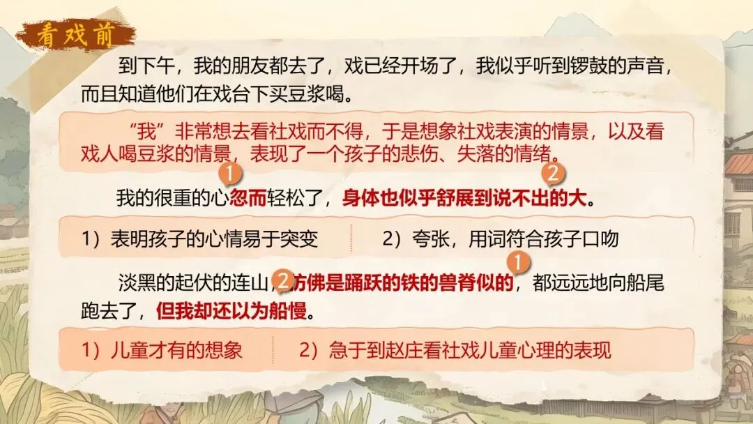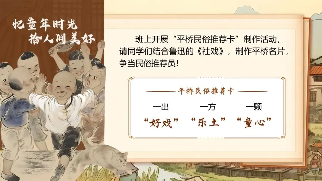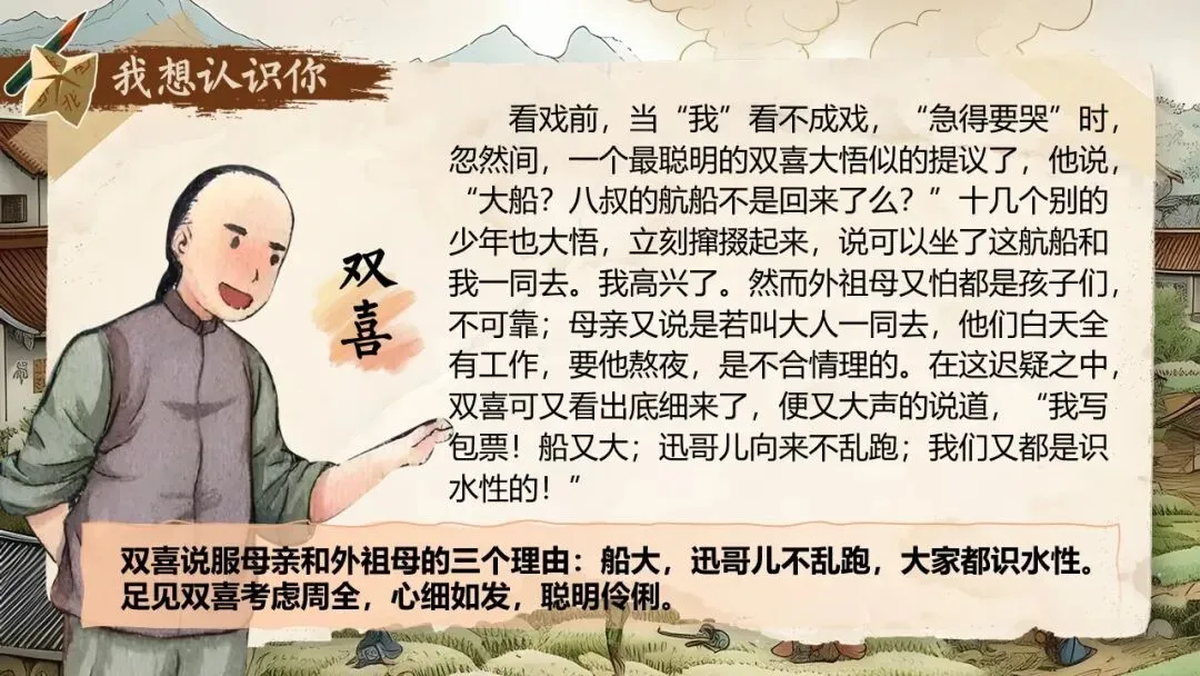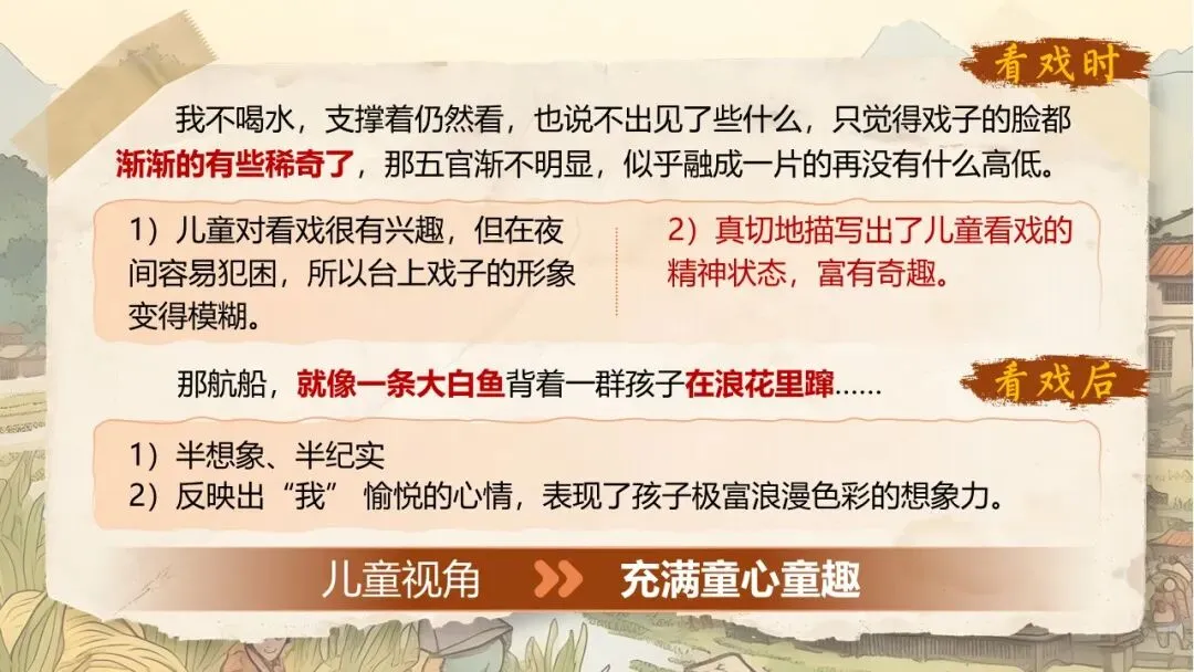 《社戏》通过叙写“我”童年时与农村孩子看社戏的美好往事,刻画了一群栩栩如生的农家孩子形象,表现了劳动人民淳朴善良、友爱无私的美好品质,展示了农村自由天地中充满诗情画意的儿童生活画卷,表达了作者对劳动人民的深厚情感和对童年美好生活的怀念之情。
