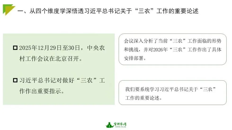 2025年12月29日至30日,中央农村工作会议在北京召开。会议深入分析了当前农业农村发展面临的形势与挑战,并对2026年的“三农”工作进行了全面部署。