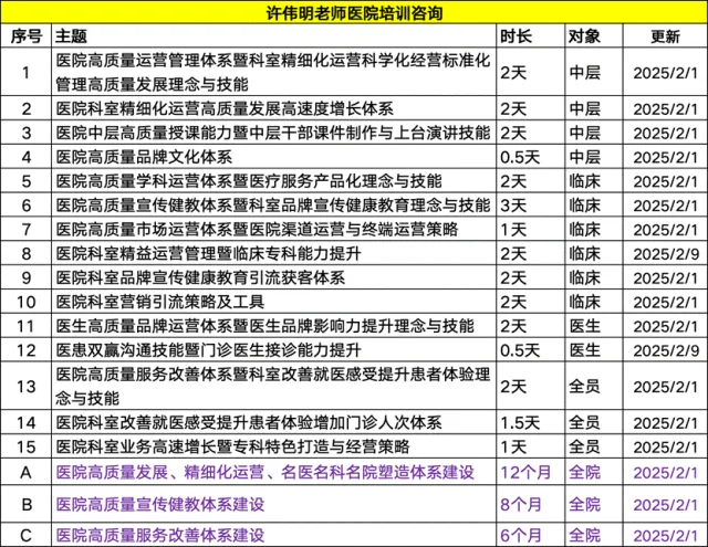 【培训老师】许伟明:医院高级培训师导师、医院品牌化运营顾问、医院产品化运营倡导者、医科室学化经营创始人、医院精细化运营践行者、名医名科名院速造专家,上海交大、上海同济、天津南开、中国科大多所高校医管班讲师。为复旦大学附属多家医院、邵逸夫医院、广东省人民医院、广东祈福医院、粤北人民医院、中山市博爱医院、广西二院、南宁一院、防城港一院、山东省中医院、聊城市人民医院、滨州医学院附属医院、陕西省妇保院、西安交大一附院、西安市儿童医院、郴州一院河南省人民医院、郑州市中心医院、洛阳市中心医院、沈阳四院、赣州市卫健委、爱康医疗集团、环球医疗集团、远东宏信集团等多家大型三甲医院和医疗集团提供培训或咨询服务。累计担任全国数十家二三级医院顾问,累计开展医院培训1千场+、培训医务人员10万+、收获学员好评1万+,累计发布原创医管文章200篇+。集多家医院成功经验于一身,成功帮助多家医院完善运营、优化学科、提升宣教、改善服务、拓展市场、塑造品牌、增长业务。