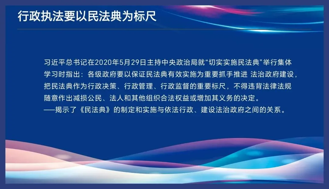 其四,民法典的实施推动着行政法律制度的完善。民法典中关于土地经营权、居住权、个人信息保护等新制度的规定,必然要求与之相关的行政管理、登记、保护等配套行政法规、规章及时立改废释,以行政手段保障民事权利的实现。行政执法人员理解这些民事新权利,有助于更精准地把握相关领域的执法重点和尺度。