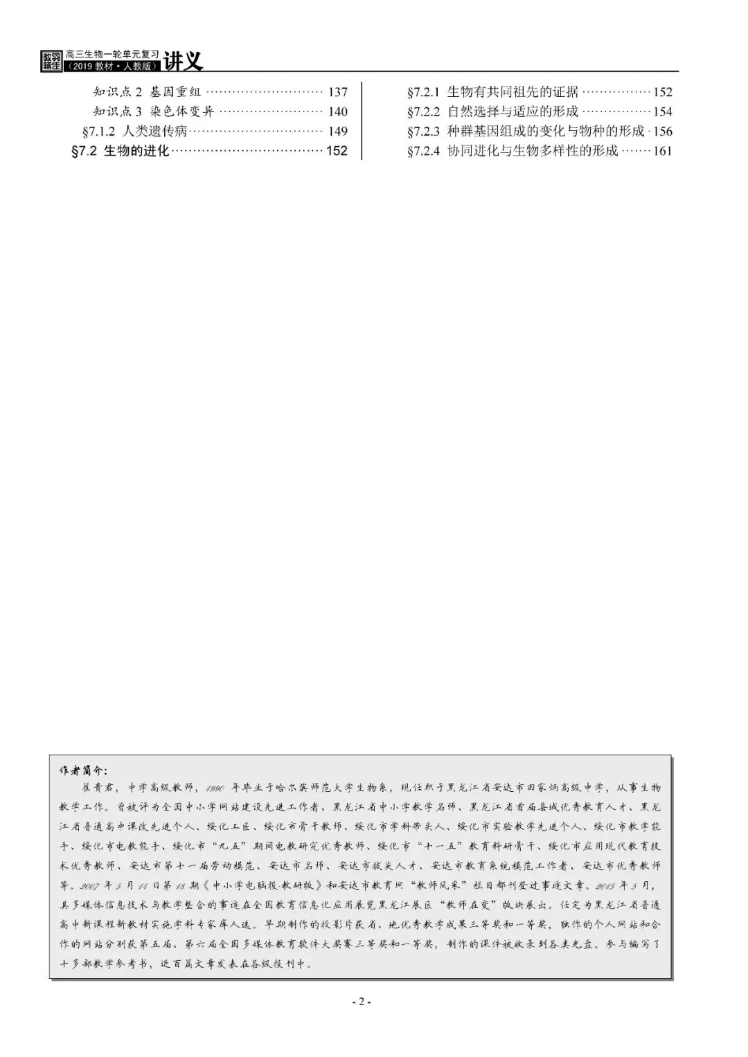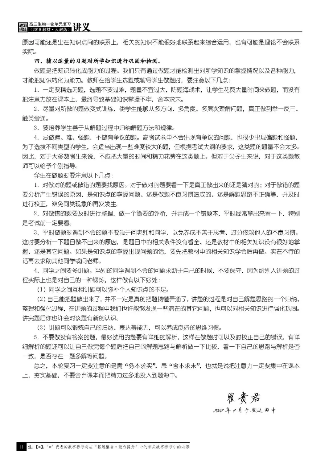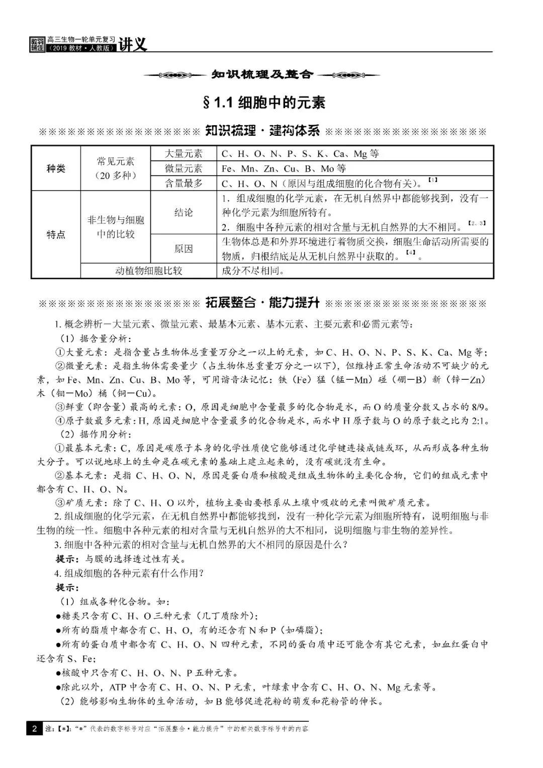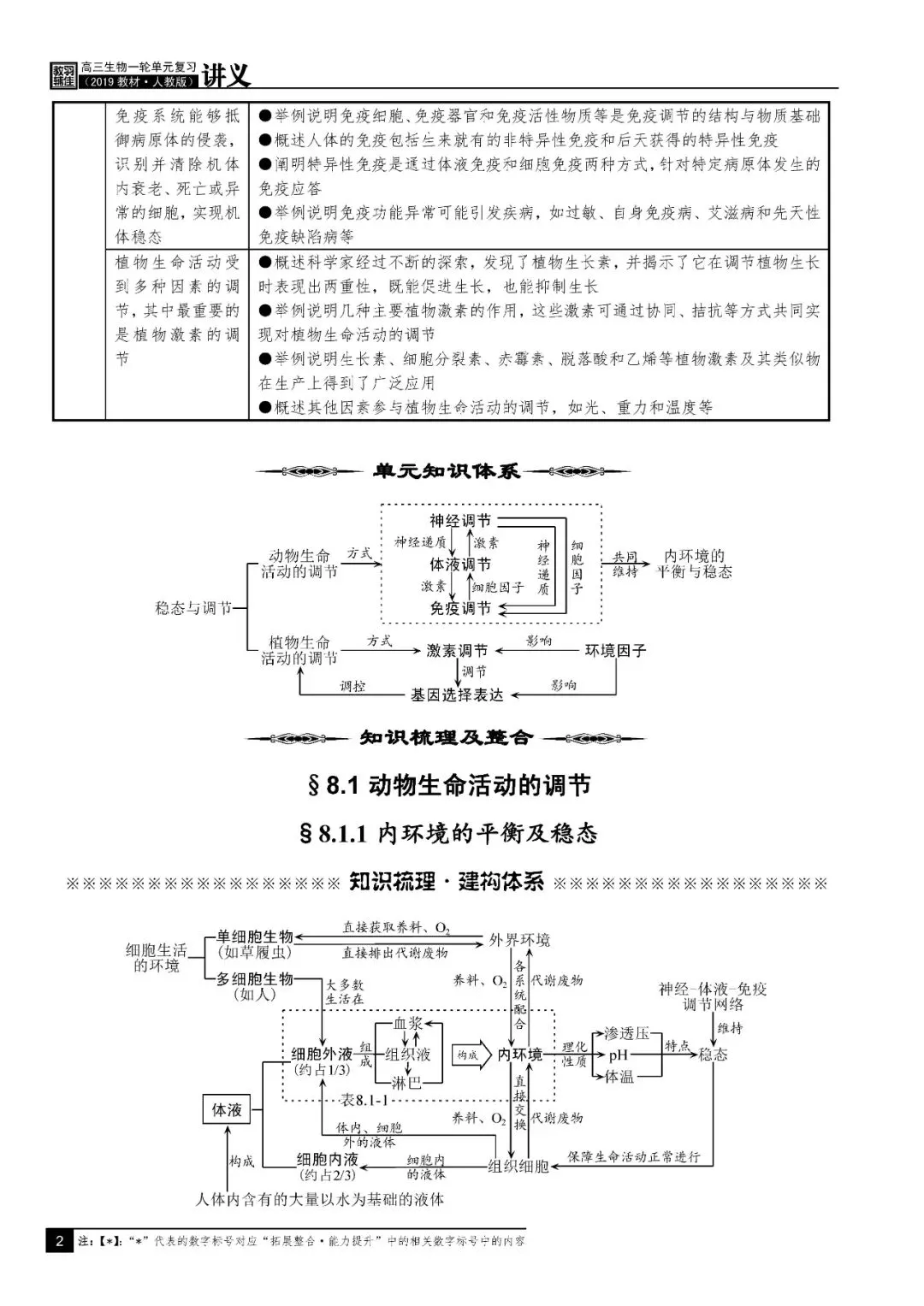 本讲义是依据2019年国家教材委员会专家委员会审核通过的人教版普通高中教科书《生物学》2本必修教材的和3本选择性必修教材编写的,把5本教材中的所有章节归纳成10个单元,分为上、下2册,上册对应2本必修教材的内容,下册对应3本选择性必修教材的内容。每个单元又划分成四个板块:单元知识内容、课标要求、单元知识体系、知识梳理及整合。其中“知识梳理和整合”是讲义的主体所在,该板块又把每个单元的知识分成大节、小节以及小节下的知识点,每节(或知识点)下又包括以下几大块内容: