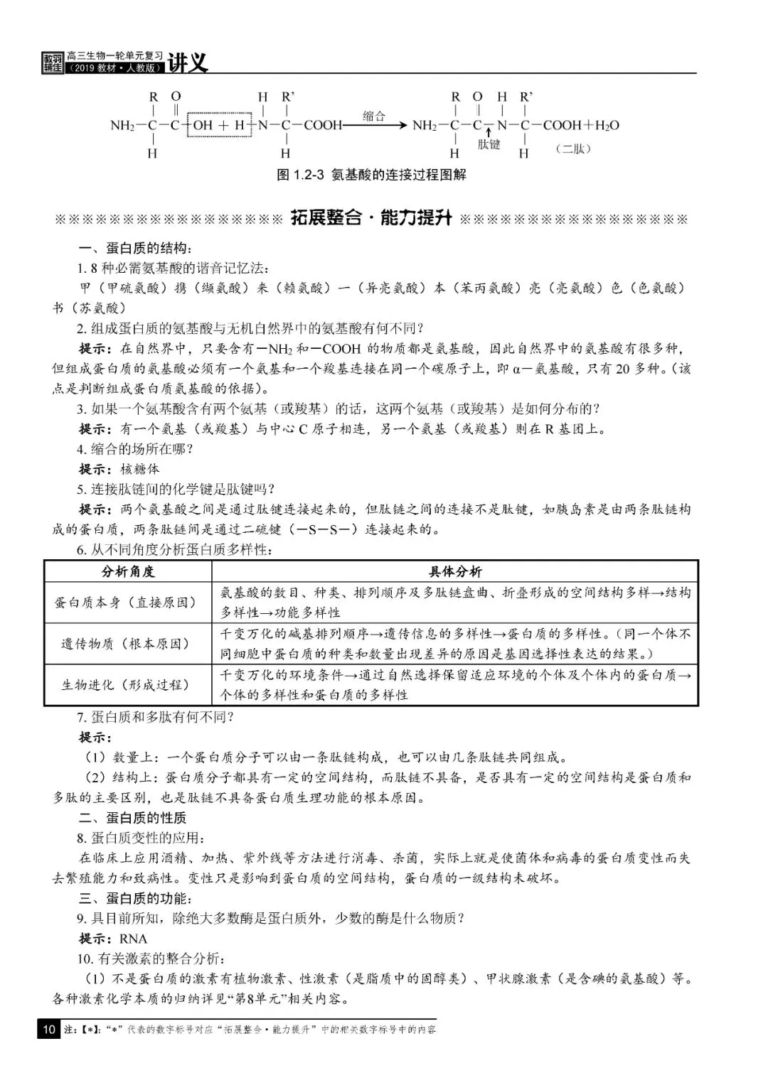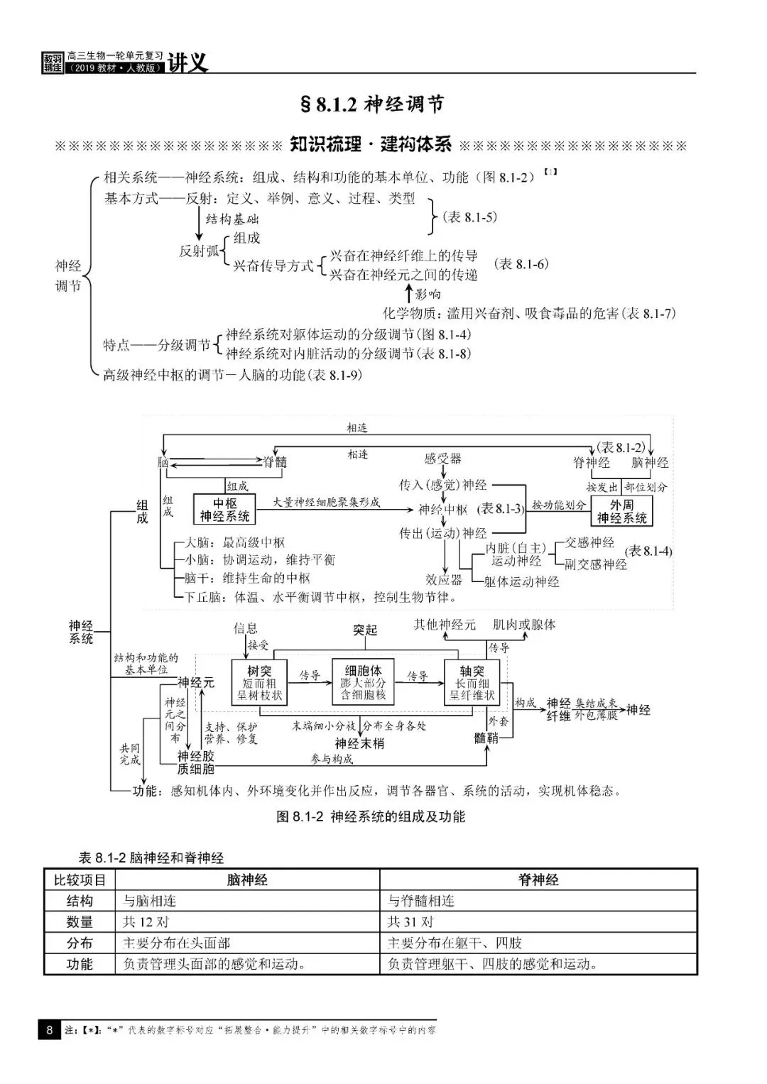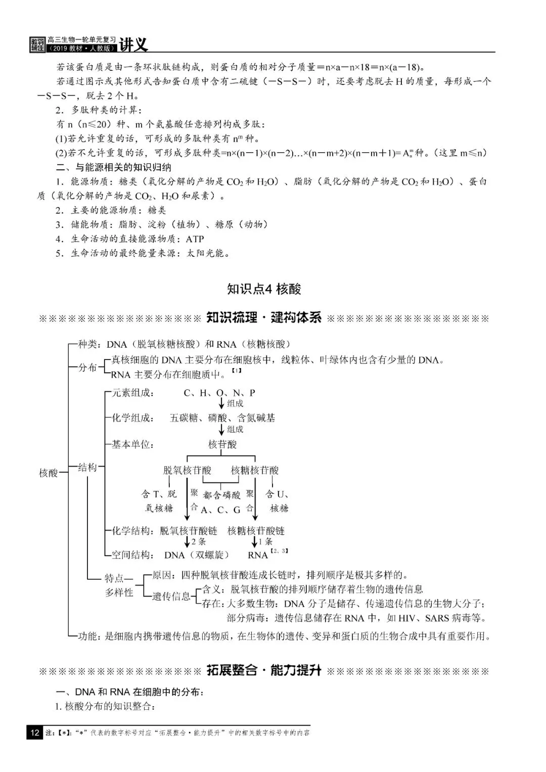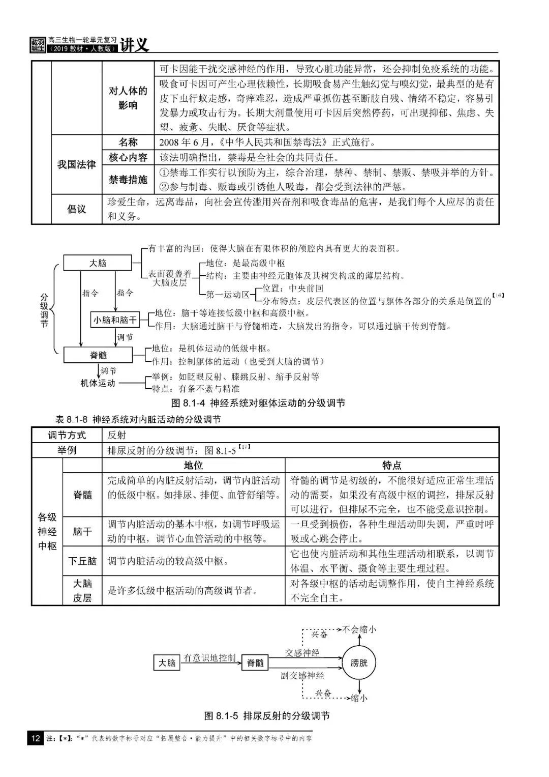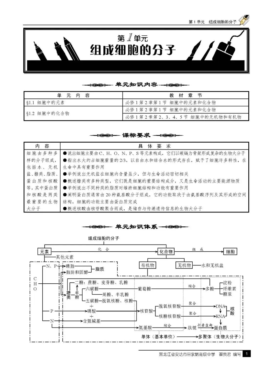 本讲义是依据2019年国家教材委员会专家委员会审核通过的人教版普通高中教科书《生物学》2本必修教材的和3本选择性必修教材编写的,把5本教材中的所有章节归纳成10个单元,分为上、下2册,上册对应2本必修教材的内容,下册对应3本选择性必修教材的内容。每个单元又划分成四个板块:单元知识内容、课标要求、单元知识体系、知识梳理及整合。其中“知识梳理和整合”是讲义的主体所在,该板块又把每个单元的知识分成大节、小节以及小节下的知识点,每节(或知识点)下又包括以下几大块内容: