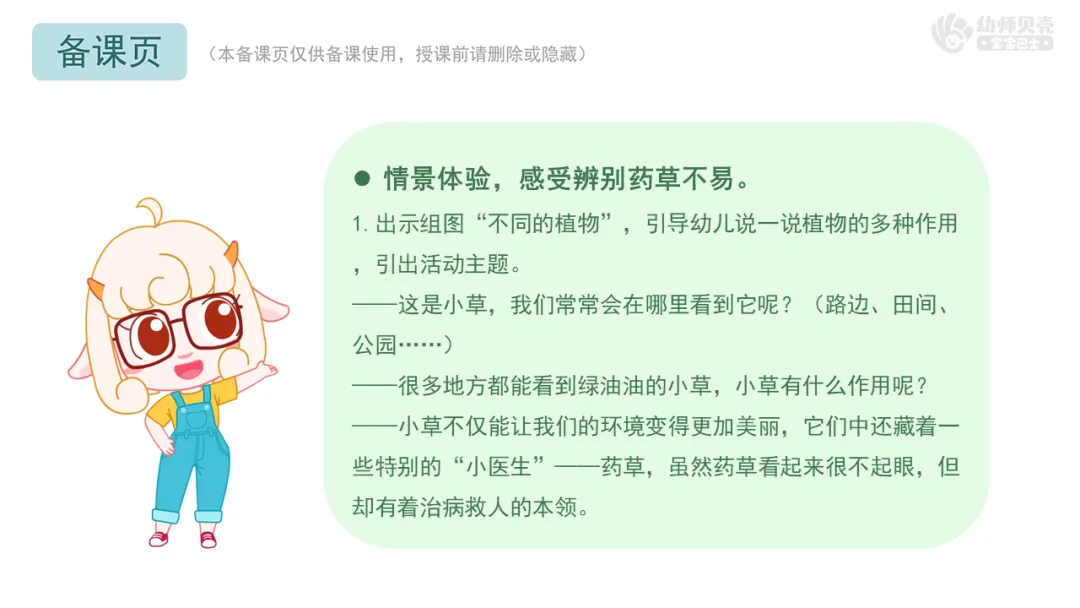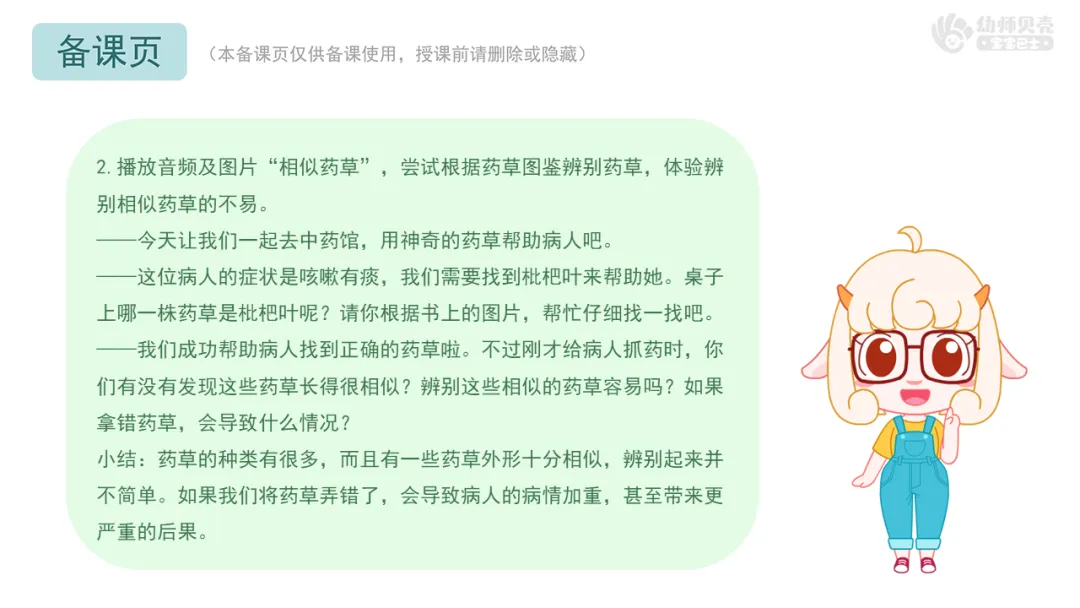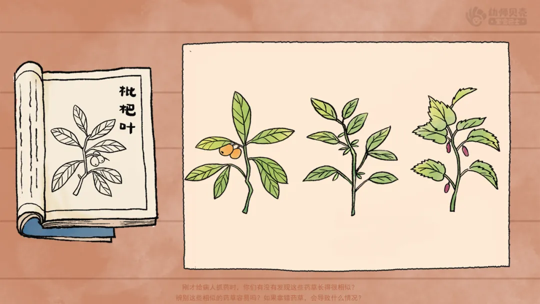 ——我们成功帮助病人找到正确的药草啦。不过刚才给病人抓药时,你们有没有发现这些药草长得很相似?辨别这些相似的药草容易吗?如果拿错药草,会导致什么情况?