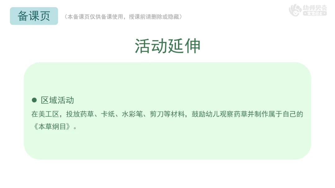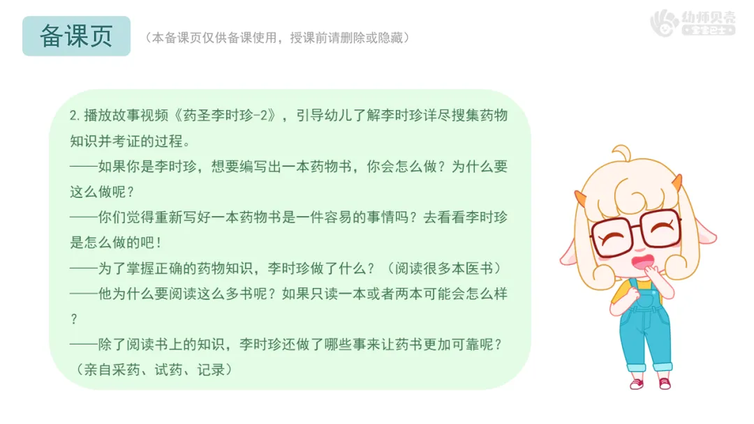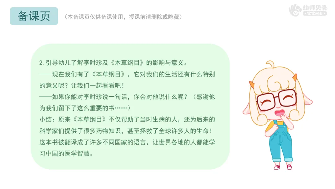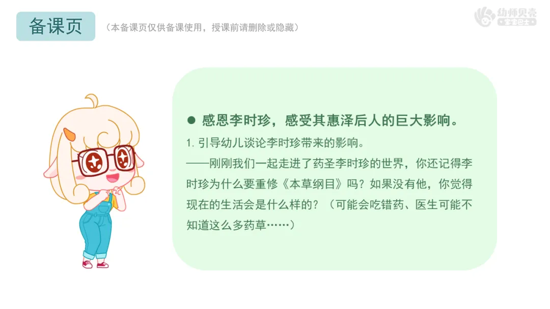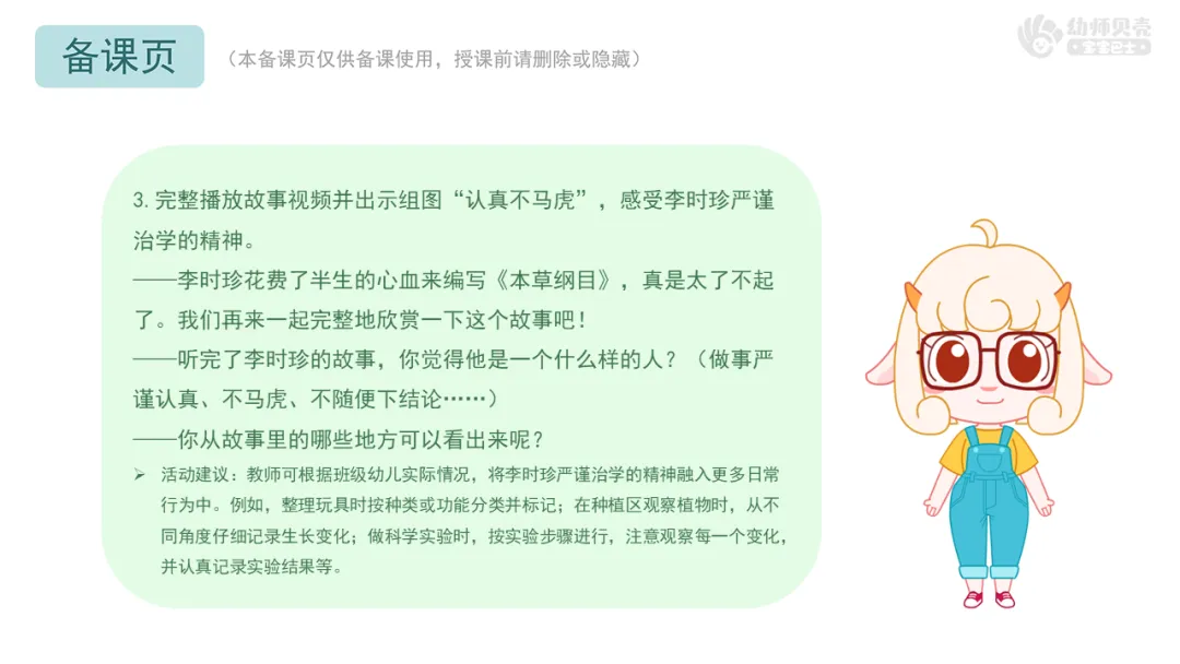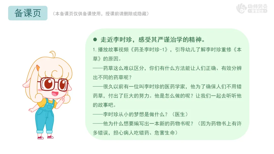 Ø活动建议:教师可根据班级幼儿实际情况,将李时珍严谨治学的精神融入更多日常行为中。例如,整理玩具时按种类或功