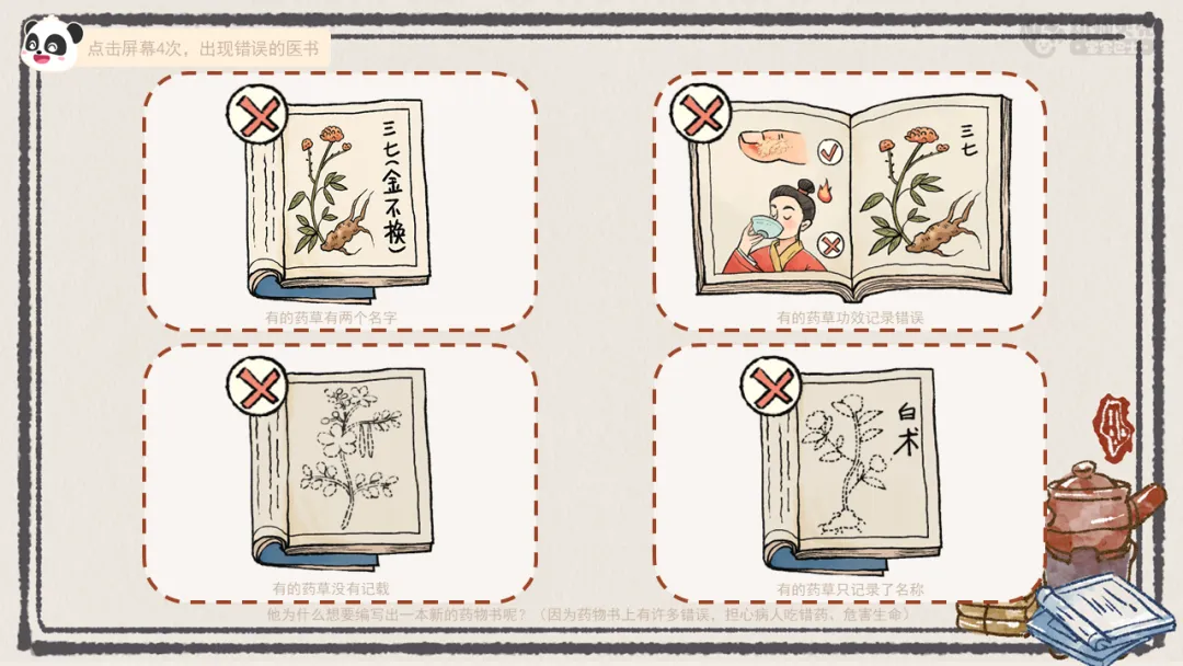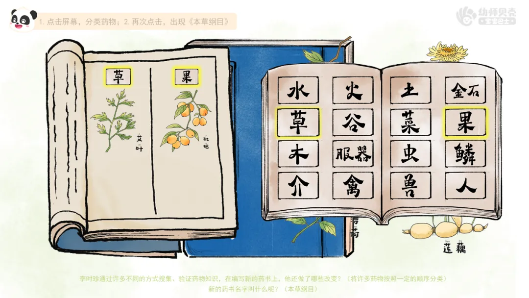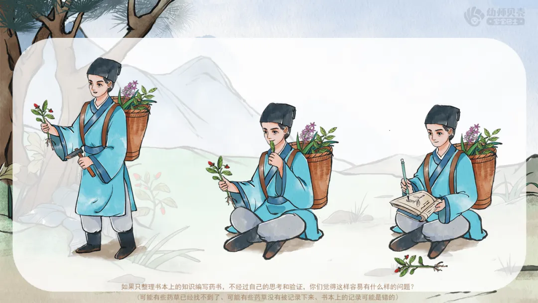 ——如果只整理书本上的知识编写药书,不经过自己的思考和验证,你们觉得这样容易有什么样的问题?(可能有些药草已经找不到了、可能有些药草没有被记录下来、书本上的记录可能是错的)